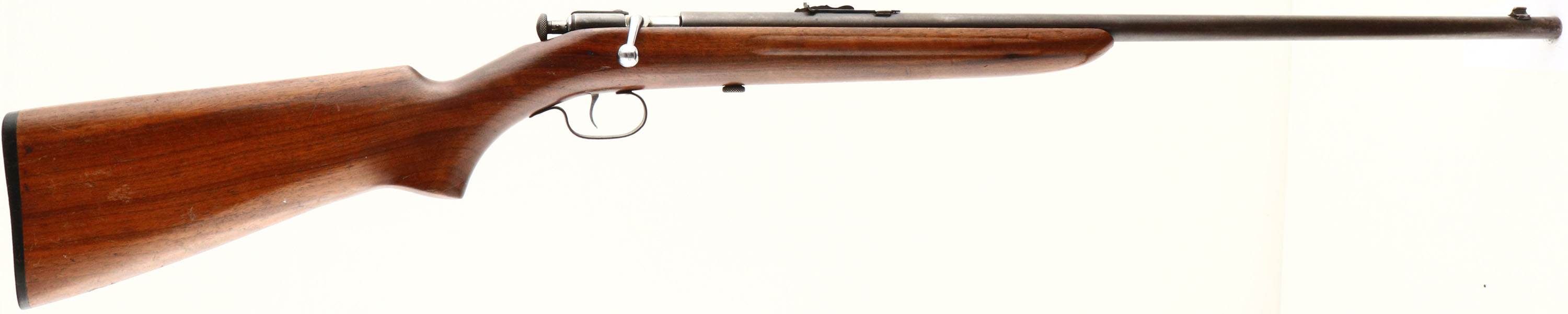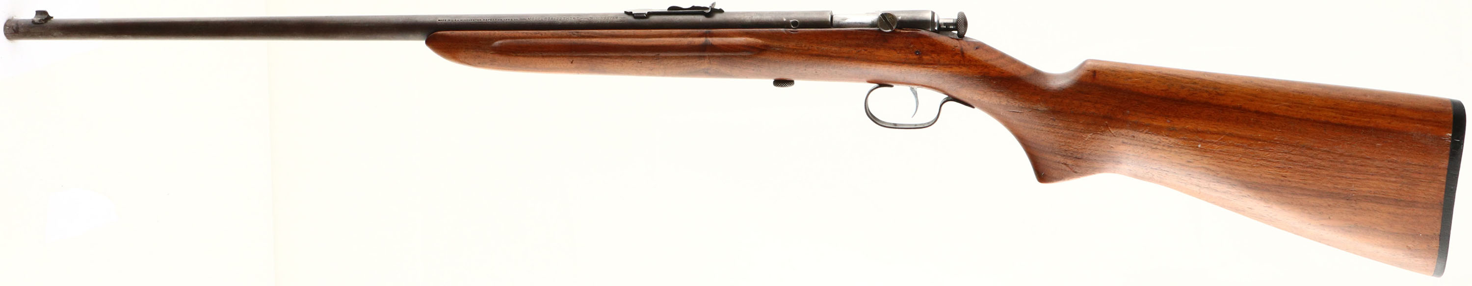 Winchester, Model 60A Sporter, Early Variation, CAL: 22 S.L.LR, MFG: 1932-39, SN: NONE, Bolt Action Rifle, 23'' barrel. This design started as the Model 58 in 1928 as the replacement for the popular Model 1902 & 1904 .22 cal. single shot rifles. It was updated & became the model 60 in 1931 & then later the model 60A, which was almost identical except the Model 60A has a chrome plated bolt, bolt handle & trigger. The Model 60A, introduced in 1932, had two variants, the Sporter & the Target. The Sporter retained the 23'' barrel length, while the Target had the 27'' barrel. The Model 60A was discontinued in 1939 with only about 6,100 of the Sporter & Target combined being sold. This particular rifle is the earliest variation of the 60A Sporter having the finger grooved forend. Making this already rare rifle even rarer. The original flat pistol grip walnut stock is excellent, with several minor contusions, scratches & scrapes to the original finish. The original metal blue finish has worn mostly gun metal gray, with a thin brown patina. Bore is excellent & bright. Barrel carries an adjustable rear & blade front sights. Original Winchester buttplate. The receiver has two holes on the left side from previous scope mount, with the rear hole being filled with a screw. The stock has a slim sliver of wood removed against the receiver below the scope holes likely needed for the placement of the scope mount. The stock also has open holes from removed scope slings. Still a collectible example due to the scarcity. FFL or C&R - Value: 300 to 600