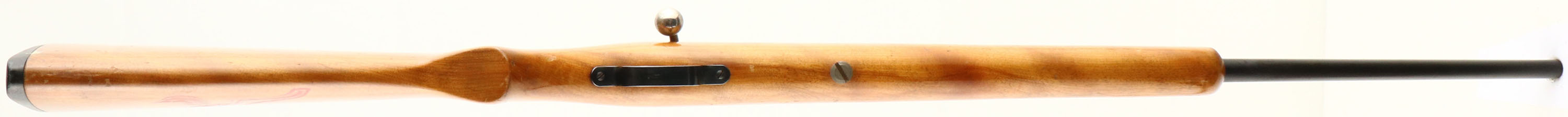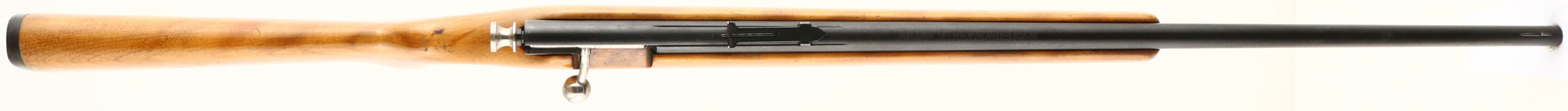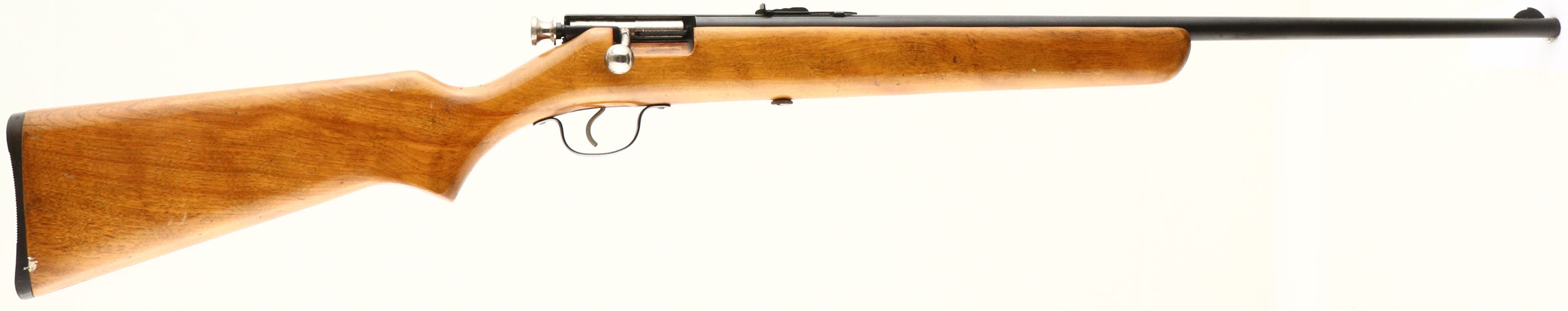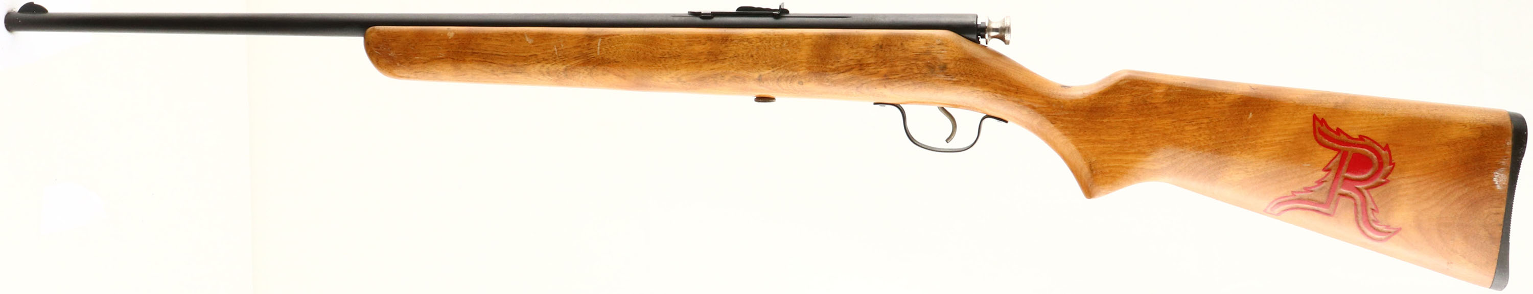 Stevens, (Savage) Model 15-B, .22 S.L. & LR., MFG. 1936-71, SN: None, Bolt Action Rifle, 24'' round barrel, Factory flat pistol grip blond wood stock is very good, with some small scratches, scuffs & scrapes. The finish appears original, but with some crackling or spider webbing. There is an interesting & nicely executed, carved large ''R'' in red on the left side of the stock. Factory metal finish rates 90% overall, with some speckling. Bore is excellent, Original factory sights. Original buttplate. FFL or C&R Req. - Value: 100 to 200
