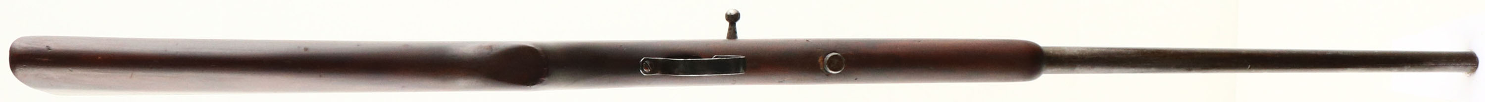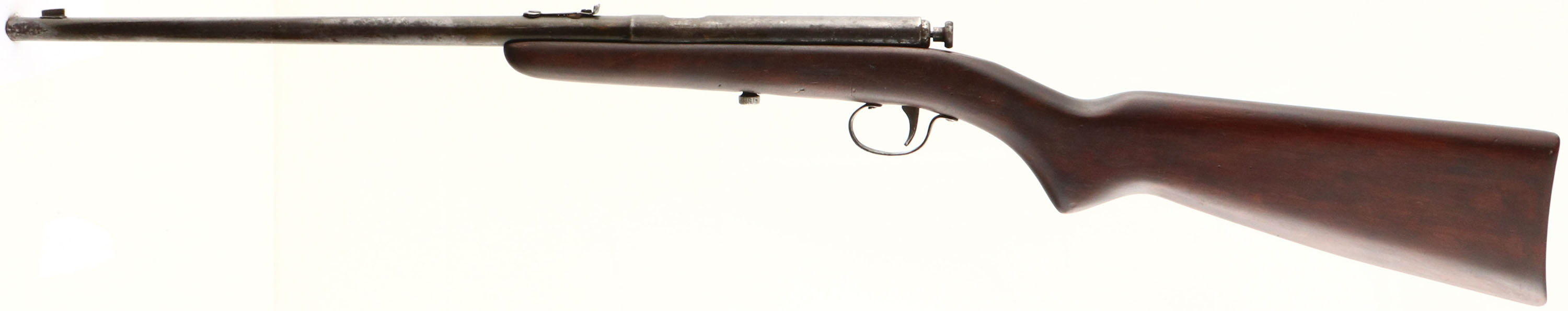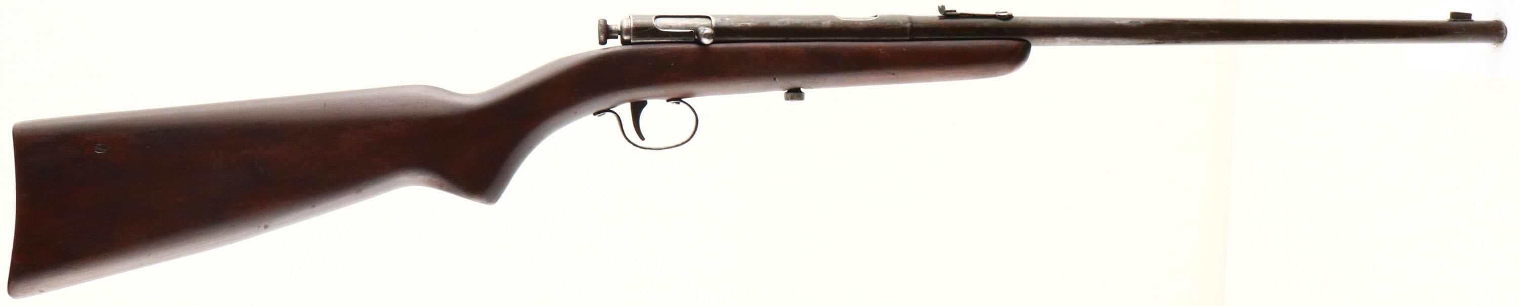 C.J Hamilton & Sons Model 47, 22 CAL S & L, MFG: 1927-32, SN: NONE, Bolt Action Rifle, 16'' round tapered barrel. The original flat knob pistol grip & flat board style stock is very good, having been sanded & refinished with a dark stain. There remains several small contusions, scrapes & scratches. Original metal blue finish has worn to a mix of retained blue, worn areas of gun metal gray & brown patina. There is a coating of varnish on the barrel which is wearing away or flaking. The steel rolled barrel has 12 grooves at 1 turn to 16''. Bore is fair, with roughness amongst worn rifling. Original blade front & adjustable rear sight. Correctly carries no buttplate. FFL or C&R Req. - Value: 80 to 150