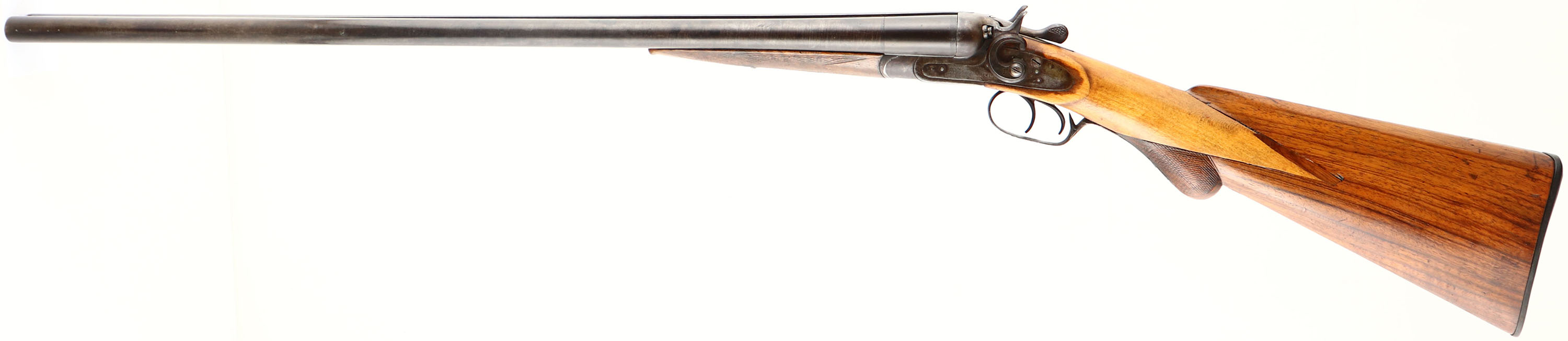 Pieper Arms Co., Model ''Modified Diana'', CAL: 12GA, MFG: 1900's, SN: 09206, Break Action SxS, 28'' Laminated Steel barrels. The side plates are marked ''PIEPER ARMS CO''. The checkered round knob stock is fair. The buttstock has been spliced together using multiple pieces of wood. It's been sanded, with added varnish. The laminated steel barrels have fully toned to a brown patina, with areas of spotting toned to a dark brown. The laminated steel pattern is still visible. The case-hardened receiver has worn to metal gray & toned to a brown patina, with case-colors remaining in heavily protected areas. There is varnish from the wood on some of the metal surfaces. Bores are good, with roughness & some light pitting. Solid rib holds a single front bead. Stock has a checkered plastic buttplate. Hammers lock back, with a small amount play & both triggers function. Some play between the barrels & frame when locked. FFL or C&R Req. - Value: 200 to 400