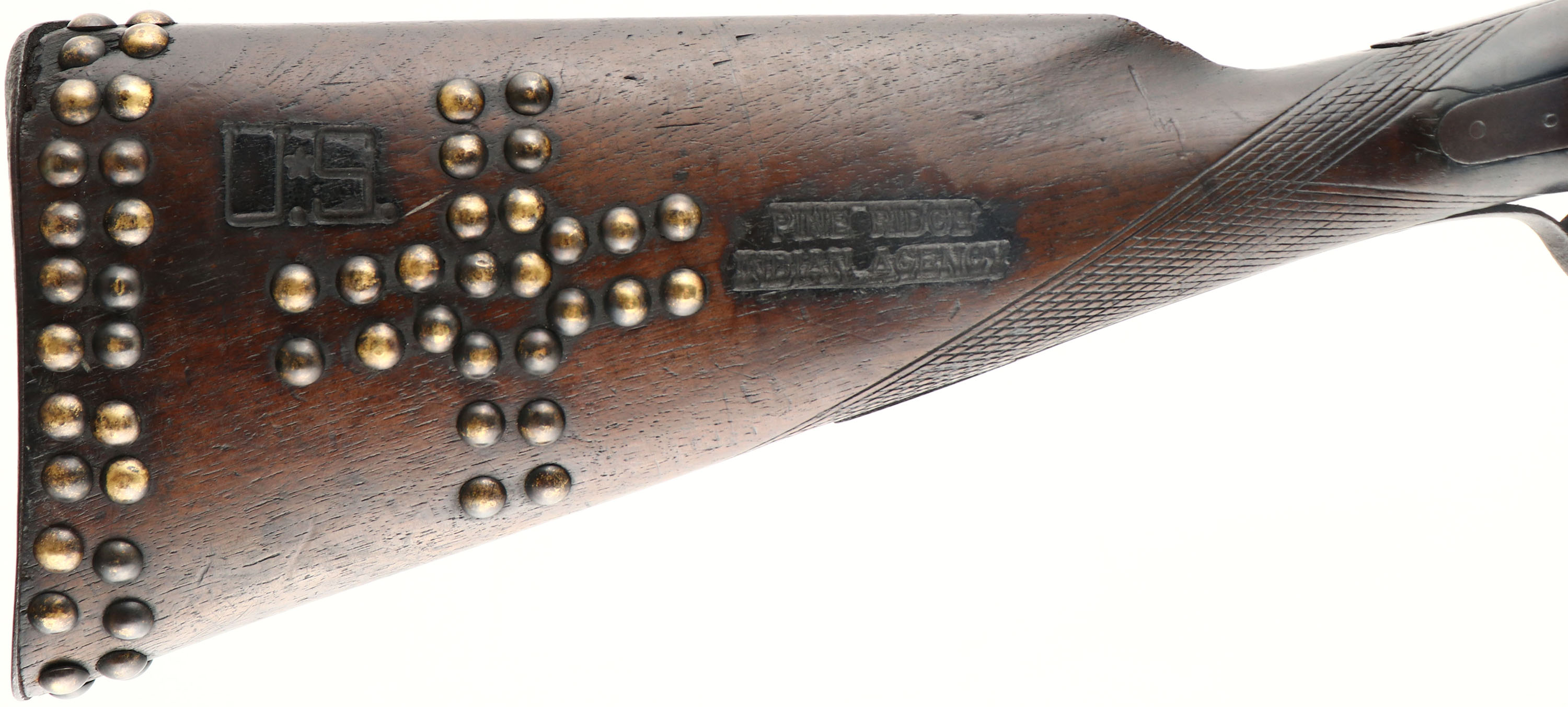 SHC (Shapleigh Hardware Co), SxS Shotgun, CAL: 12GA, MFG: N/A, SN: NONE, Break Action SxS Shotgun, 20 1/2'' barrels. The original wood stock is fair, there is a large separated crack at the wrist & multiple other crack coming off the side plates. The stock has brass tacks & is marked with U.S, U.S Indian Police, & Pine Ridge Indian Agency stampings. The metal surfaces are dark & rusty. Bores are poor. Front bead. Missing right hammer. Underlever is bowed. SOLD AS IS NO RETURNS. Antique, No FFL Req. - Value: 100 to 200