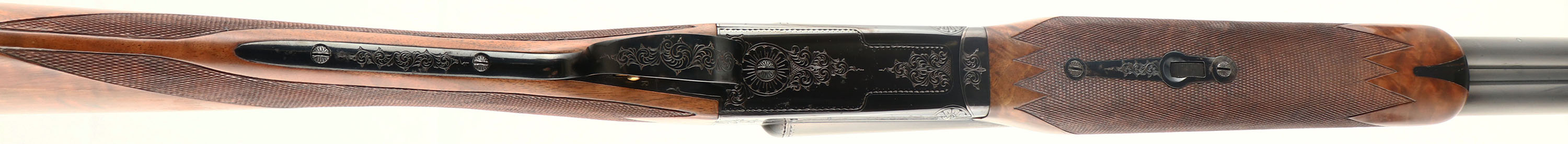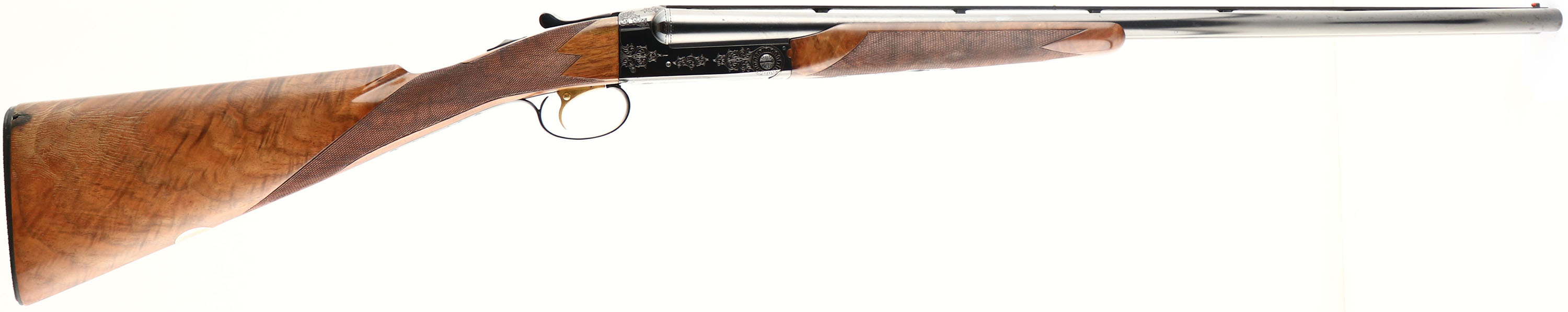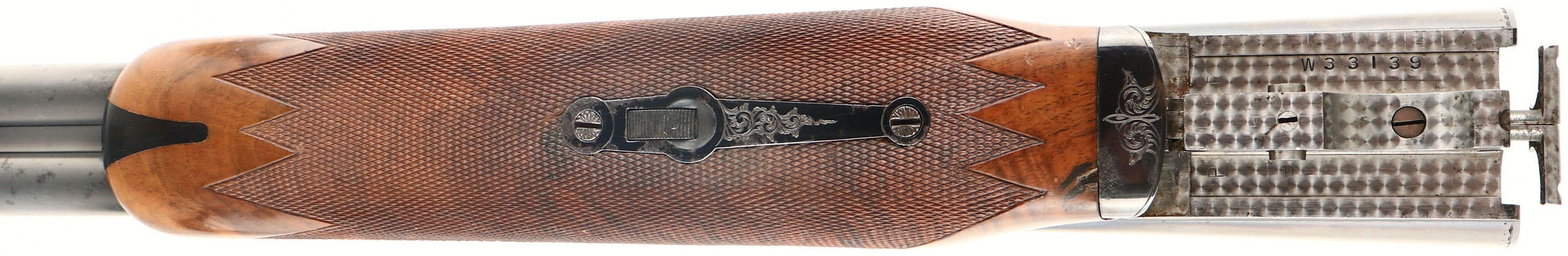 RARE Winchester Model 21- 1 Custom Grade, Two Barrel Set. CAL: 20 GA, MFG: 1931-90, SN: W33139, Break Action SxS Shotgun, Barrel Set 1: 28'' Winchester Proof Steel, with raised matted ventilated rib, white mid bead & red front bead, Top of rib engraved ''CUSTOM BUILT BY WINCHESTER FOR G.L. ELLIOT''. Left tube stamped ''WINCHESTER 20 GAUGE 3 IN CHAM''. Bottom of tubes with choke markings ''FULL/FULL''. Jeweled barrel flats, with SN & Winchester proof marks. Barrel set 2: Made exactly the same as set 1, but 26'' barrels & choke markings ''CYL/MOD''. Both barrel sets carry their own original, fine hand checkered in point pattern, beavertail forends, with rounded triangular ebony tips. Matching SN stamped on forend steel & wood. The deluxe grade, fancy walnut stock displays fantastic rippled & feathered grain. The straight grip features a fine hand checkering & gold oval on belly with the initials ''GLE'' engraved onto it. The stock carries a checkered Winchester plastic buttplate. The stock has water damage, which has caused the finish on the lower half of the stock to crinkle & flake away. There is some black staining in the area as well & a couple of small edge chips in the darkened areas on each side of the comb. The receiver features 21-1 pattern hand engraving of scrolls & border detailing. This pattern provides about 25% coverage. Then engraving extends onto the trigger guard & steel portions of the forend. The metal blue finish on the receiver is toning a beautiful plum, rating 99%, with some light speckling on the belly of the receiver. The barrels appear to carry the original blued finishes, with 98% coverage & loss due to spotty areas of corrosion. The 26'' bores are excellent, while the 28'' bores are very good, with use striations. The shotgun weighs 6lbs 9 1/2 oz with the 26'' barrels. LOP is 13 7/8'', DAC 1 1/2'', DAH 2 1/2''. With approximately only 40,000 Model 21 shotguns produced in all grade & all model 21's being custom ordered, they are often considered the pinnacle of Winchester shotgun collecting. This example has great bones & can be used & enjoyed in its present condition, or taken to an expert professional restorer to recapture its full beauty. FFL Req. - Value: 5000 to 10000