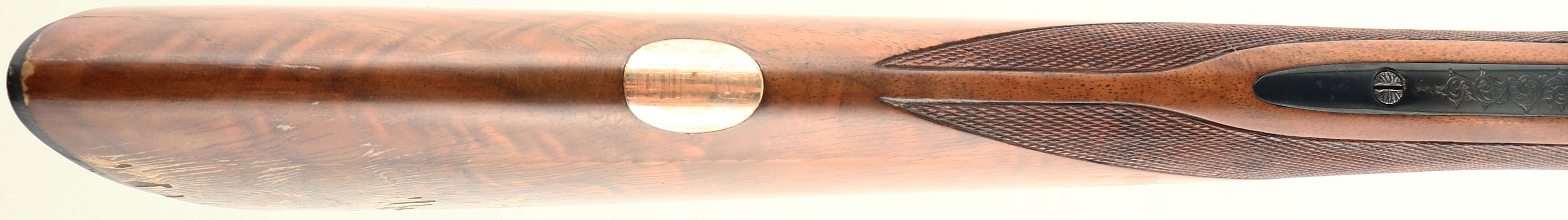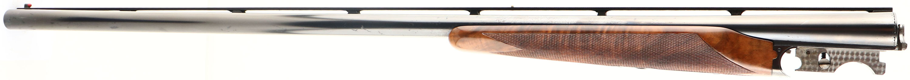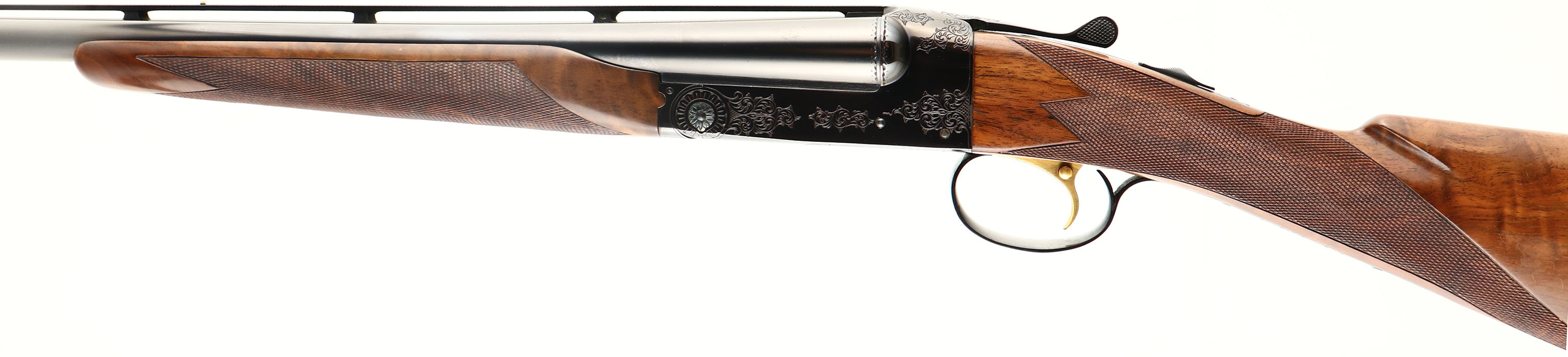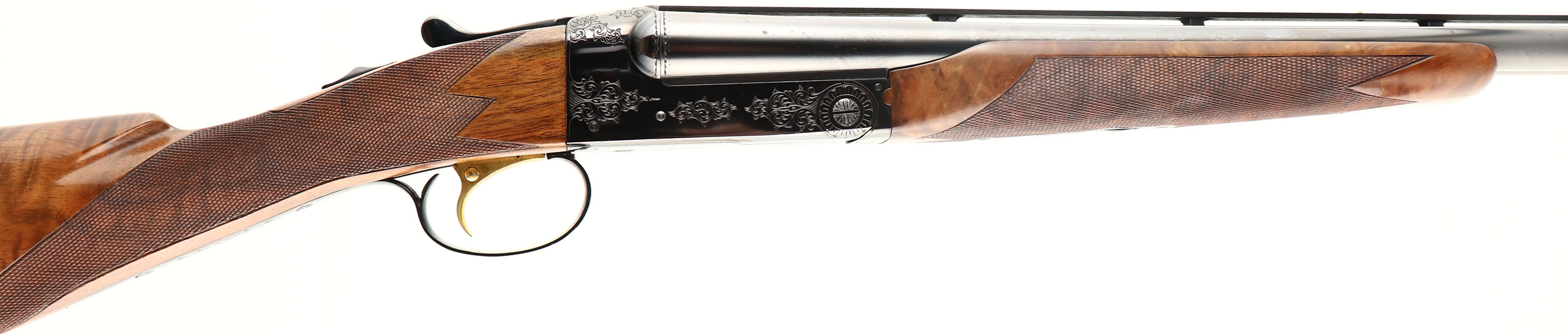 RARE Winchester Model 21- 1 Custom Grade, Two Barrel Set. CAL: 20 GA, MFG: 1931-90, SN: W33139, Break Action SxS Shotgun, Barrel Set 1: 28'' Winchester Proof Steel, with raised matted ventilated rib, white mid bead & red front bead, Top of rib engraved ''CUSTOM BUILT BY WINCHESTER FOR G.L. ELLIOT''. Left tube stamped ''WINCHESTER 20 GAUGE 3 IN CHAM''. Bottom of tubes with choke markings ''FULL/FULL''. Jeweled barrel flats, with SN & Winchester proof marks. Barrel set 2: Made exactly the same as set 1, but 26'' barrels & choke markings ''CYL/MOD''. Both barrel sets carry their own original, fine hand checkered in point pattern, beavertail forends, with rounded triangular ebony tips. Matching SN stamped on forend steel & wood. The deluxe grade, fancy walnut stock displays fantastic rippled & feathered grain. The straight grip features a fine hand checkering & gold oval on belly with the initials ''GLE'' engraved onto it. The stock carries a checkered Winchester plastic buttplate. The stock has water damage, which has caused the finish on the lower half of the stock to crinkle & flake away. There is some black staining in the area as well & a couple of small edge chips in the darkened areas on each side of the comb. The receiver features 21-1 pattern hand engraving of scrolls & border detailing. This pattern provides about 25% coverage. Then engraving extends onto the trigger guard & steel portions of the forend. The metal blue finish on the receiver is toning a beautiful plum, rating 99%, with some light speckling on the belly of the receiver. The barrels appear to carry the original blued finishes, with 98% coverage & loss due to spotty areas of corrosion. The 26'' bores are excellent, while the 28'' bores are very good, with use striations. The shotgun weighs 6lbs 9 1/2 oz with the 26'' barrels. LOP is 13 7/8'', DAC 1 1/2'', DAH 2 1/2''. With approximately only 40,000 Model 21 shotguns produced in all grade & all model 21's being custom ordered, they are often considered the pinnacle of Winchester shotgun collecting. This example has great bones & can be used & enjoyed in its present condition, or taken to an expert professional restorer to recapture its full beauty. FFL Req. - Value: 5000 to 10000