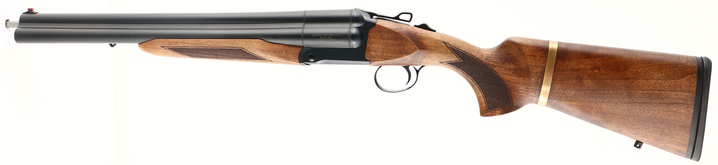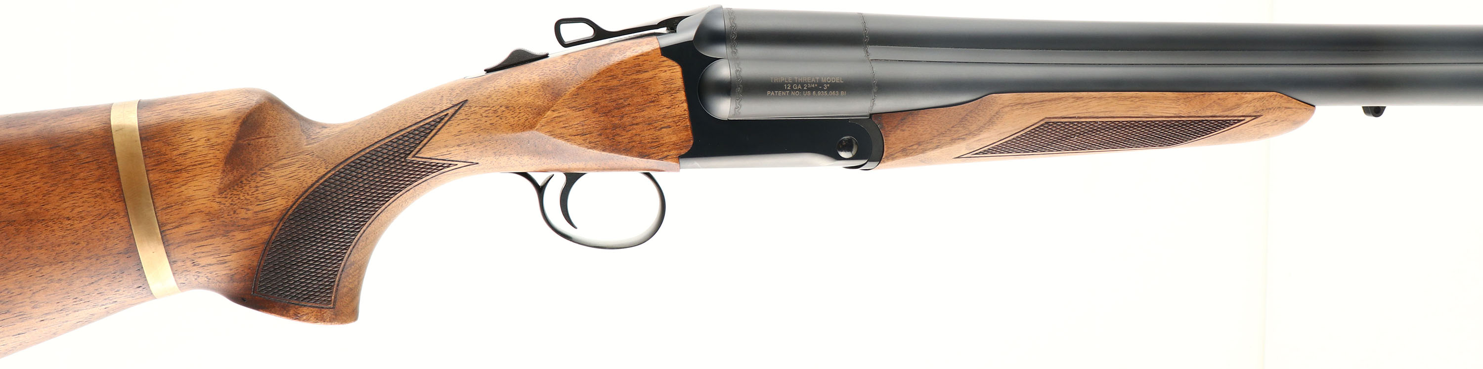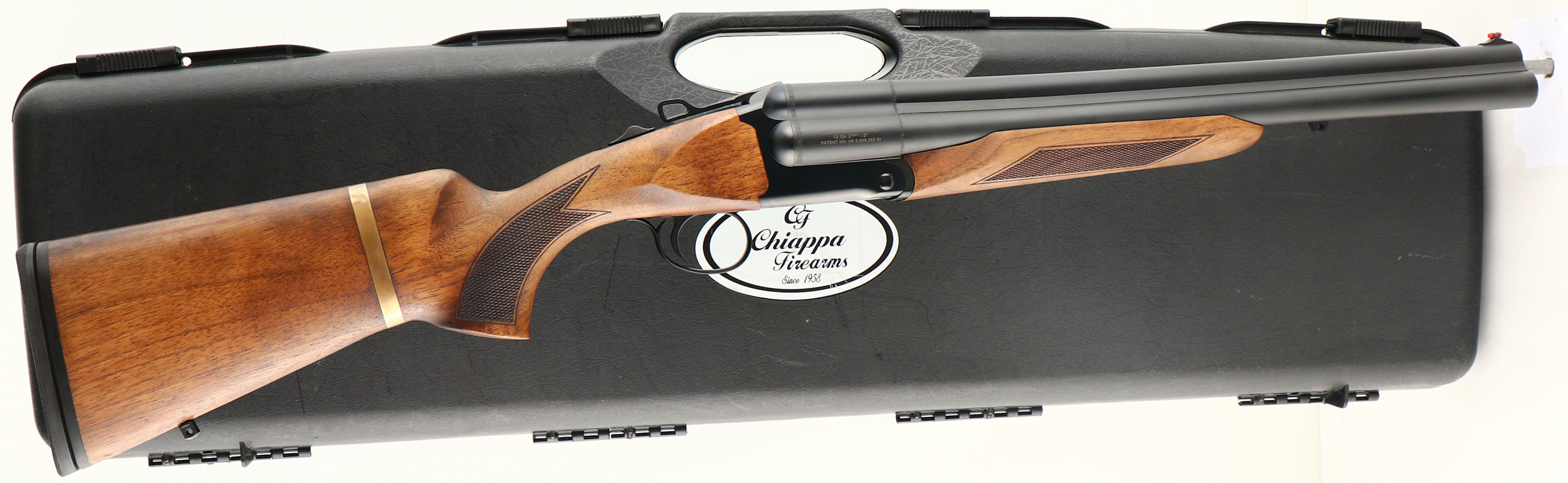 CASED Chiappa, Model Triple Threat, CAL: 12 GA, MFG: Modern, SN: TC01736, Break Action SxS+ Shotgun, Screw-in chokes, with 5 total tubes. 18 1/2'' barrels. The original checkered & flat pistol grip walnut stocks are basically mint, having a hand oiled finish. Decorative brass band around stock is unusual, but factory standard. The original metal finishes are excellent. Bores are excellent. Extractors. The top barrel holds a fiber optic front sight. Single non-selective mechanical reset single trigger system. Manual Safety. Sling provisions. Buttstock carries a solid recoil pad. LOP: 14 1/4'' overpad. Comes in its original hard case, with packaging, extra chokes, choke tool & 1/4'' ''T'' handle Allen wrench. A really cool self defense or multi use shotgun. MSRP: $2,165. FFL Req. - Value: 1000 to 2100