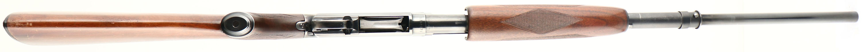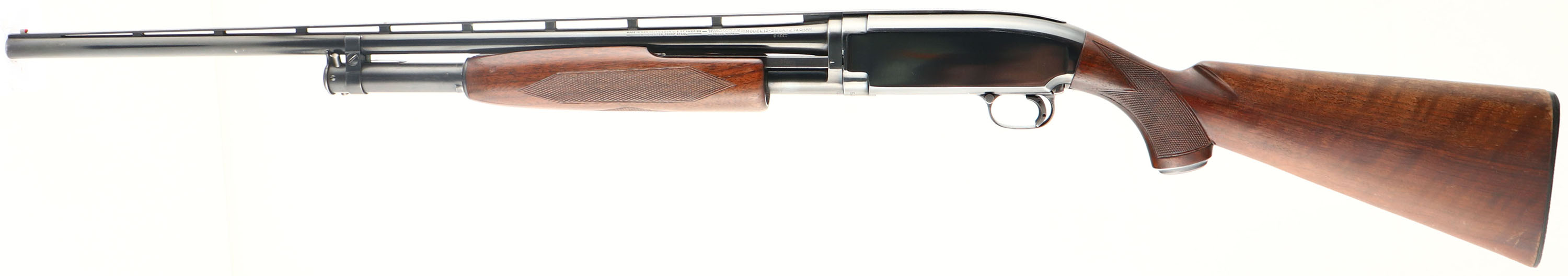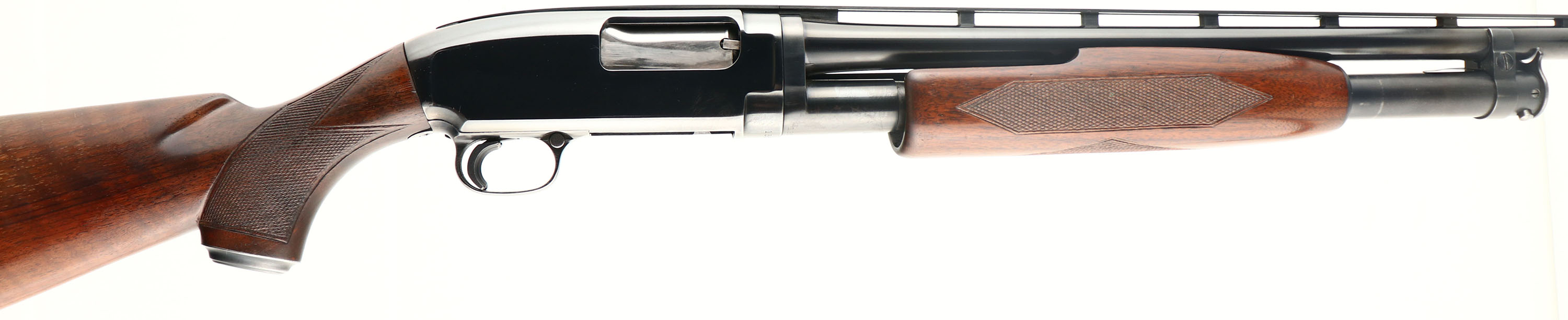 Winchester, Model 12 ''SKEET'', CAL: 28 GA, MFG: 1950, SN: 1352073, Pump Action Shotgun, Choke: Marked ''SKEET'', 2 7/8'' Chamber, 26'' Ventilated rib barrel. This gun presents as a very rare factory Model 12 .28 ga ''Skeet'' shotgun, however, it is simply a custom modified/built shotgun. The original checkered & capped pistol grip wood stocks are excellent, with some minor handling marks, scrapes or blemishes to the original finish. The finish has some areas of light haze & is thinning at the carry points & left cheek, with some thin flaking on the right cheek. The metal finish on the receiver appears original, but may be a very good vintage reblue & rates 90%. The metal blue finish on the barrel is a professional quality reblue, likely done at the time of the rib installation & rates 95%. The bluing on the receiver appears original, but could also have been done at the time of the barrel reblue & rates 90%. Most of the wear is to the forward belly of the receiver & the belly of the barrel collar in front of the receiver. Matching SN on the receiver & barrel. There is a single proof stamping on the barrel to the left side of the rib. There are no markings on the rib, but it has square posts which might help some identify the make. Bore is excellent. Bore diameter : .548, Bore restriction: .013. Rib carries a white mid bead & a red front bead. Trigger carries an oversized trigger shoe. Buttstock carries a Winchester plastic buttplate, with 13 7/8'' LOP. FFL or C&R Req. - Value: 1500 to 4000