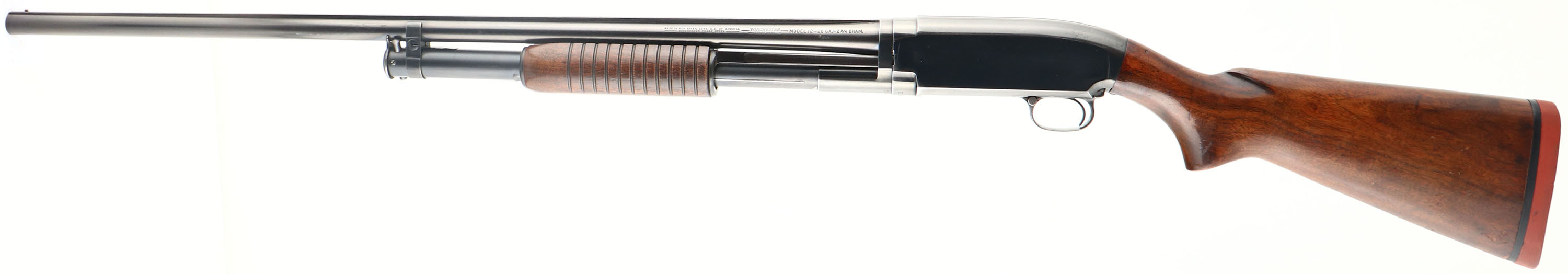Winchester, Model 12, CAL: 20 GA, MFG: 19505, SN: 1353921, Pump Action Shotgun, Choke: FULL, 2 3/4'' Chamber, 28'' Solid rib barrel. The original flat pistol grip wood stocks are excellent, with minor handling marks, scrapes or blemishes to the thinning & partial flaking original finish. The original metal blue finish rates 90% on barrel. 85% on the receiver & mag tube, with most of the wear to the edges & belly of the receiver. Bore is excellent. Single silver front bead on rib. Buttstock carries a red Winchester solid recoil pad,, with 13 1/2'' LOP over pad. FFL or C&R Req. - Value: 400 to 800