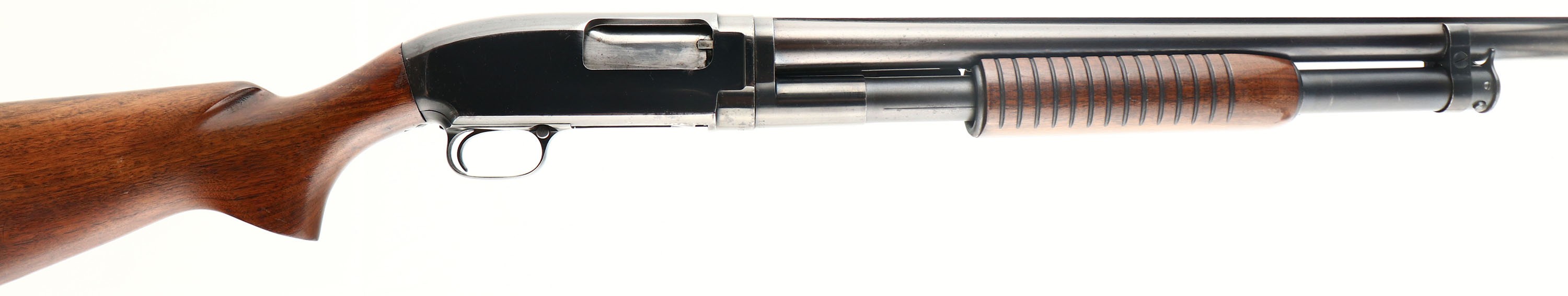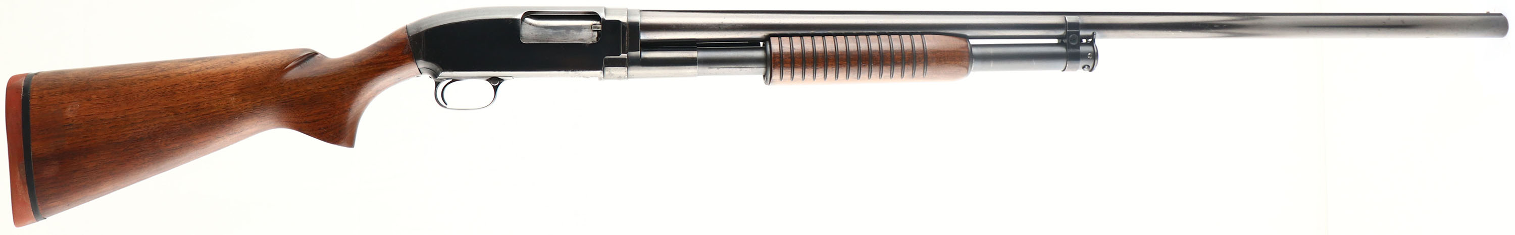 Winchester, Model 12 Duck Gun, CAL: 12 GA, MFG: 1950, SN: 1324252, Pump Action Shotgun, Choke: FULL, 3'' Chamber, 32'' Solid rib barrel. This gun has the barrel length, solid rib, chamber & choke of a typical ''Duck Gun''. The original flat pistol grip wood stocks are excellent, with the lower portion of the stock having been previously sanded in a couple of areas & nicely refinished. The forend appears to carry the original finish. There are very few minor blemishes to the wood, The original metal blue finish rates 75% overall, with thinning & spotty loss, & a couple of small areas of cleaned rust pitting on the left side of receiver. Bore is excellent. Silver single front bead on rib. Buttstock carries a Winchester solid red recoil pad, with 13 7/8'' LOP over pad. FFL or C&R Req. - Value: 600 to 1000