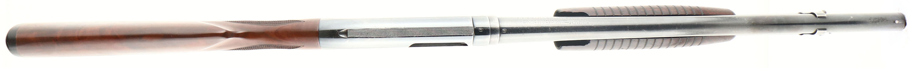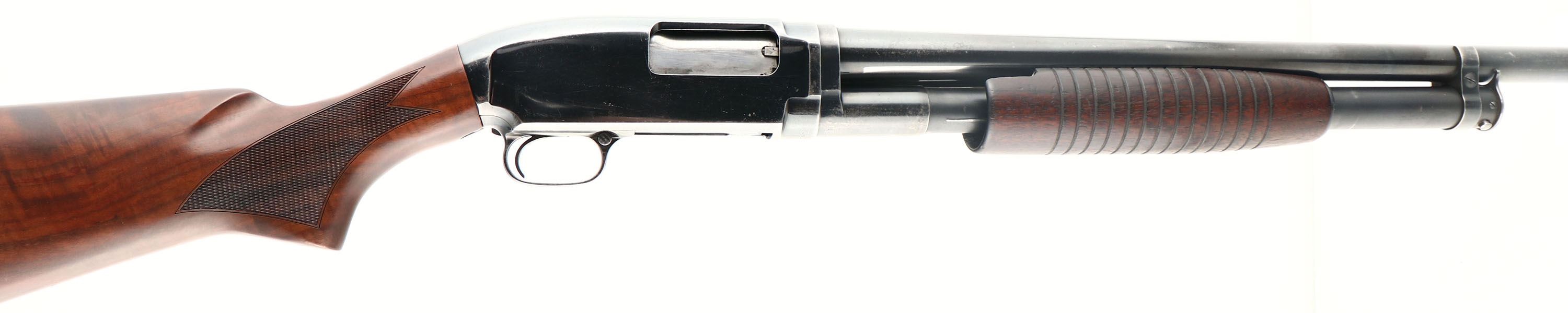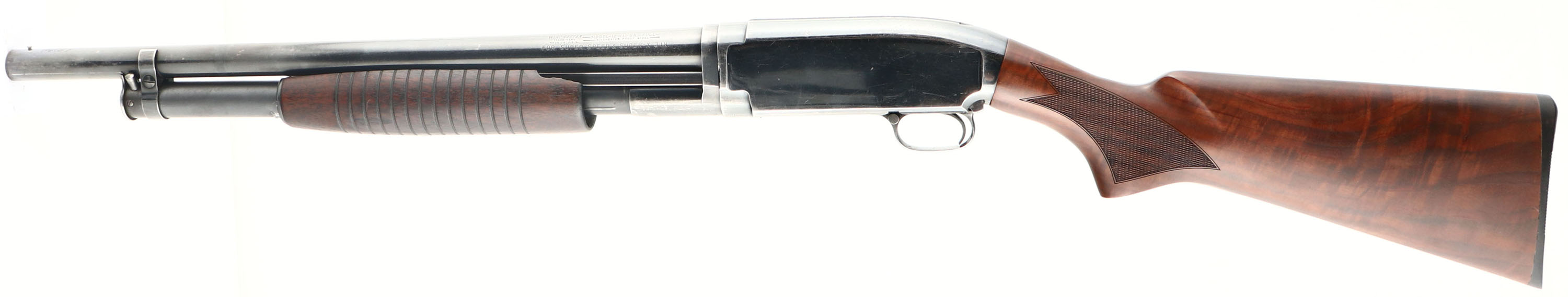Winchester, Model 12, CAL: 12 GA, MFG: 1954, SN: 1600758, Pump Action Shotgun, Choke: FULL, 3'' Chamber, 20 1/4'' No rib barrel. The checkered & flat pistol grip wood stock is an excellent replacement from Boyd's. The grain is fantastic, with fit & finish being excellent & are just a couple of fine line scratches to the original finish. The original forend is excellent, with some tiny edge chipping along the back left edge. The finish has darkened with age, wear & oils. The original metal blue finish rates 75% overall. Bore is excellent. Single front bead. Buttstock carries a Boyd buttplate, with 14 1/4'' LOP. FFL or C&R Req. - Value: 300 to 600