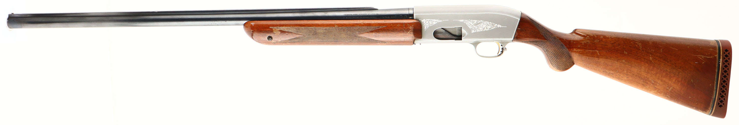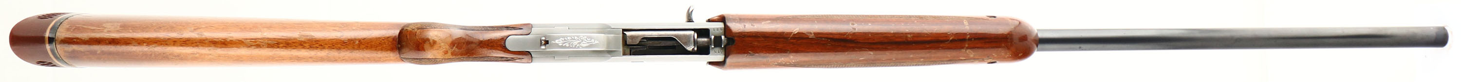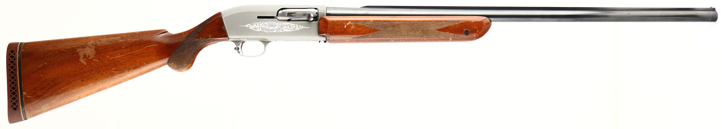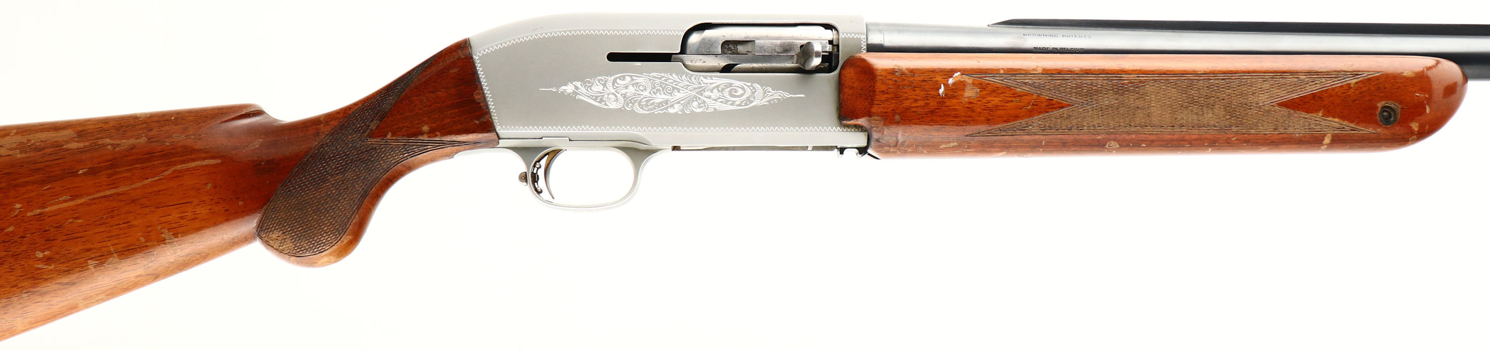 Browning, Belgium, Double Automatic, Twelvette, CAL: 12 GA, MFG: 1952-56, SN: A15081, Semi Auto Shotgun, 2 3/4'', Full Choke, 27 1/2'' Solid rib barrel with silver front bead. The original checkered & round knob pistol grip wood stocks are good, with numerous small to large scrapes, scratches & contusions to the wood & original finish, with one large contusion in the checkering of the right side of pistol grip. The finish has large areas of flaking or flaking & wear. The steel barrel retain 90% of the original metal blue finish. The hiduminum (aircraft alloy) receiver is anodized with the ''Velvet Grey'' finish & rates very good, with minor scrapes or scratches. The receiver & trigger guard are decorative hand scroll engraved. Bore is very good. Stock carries a Pachmayr ventilated recoil pad. LOP 15''. FFL or C&R Req. - Value: 300 to 600