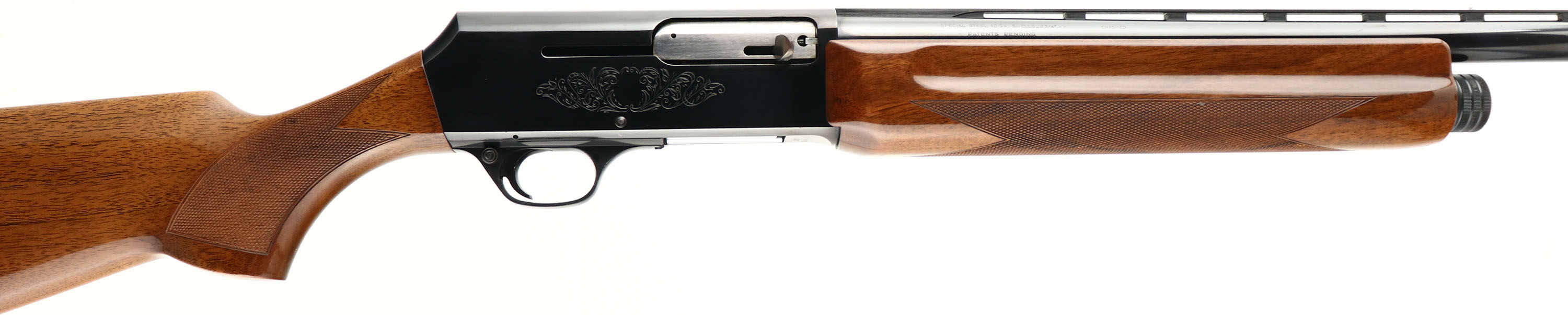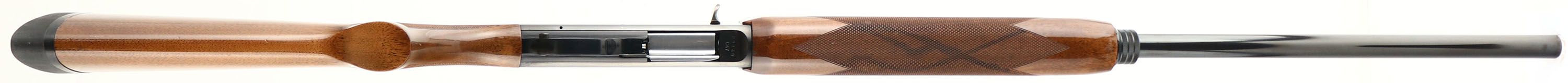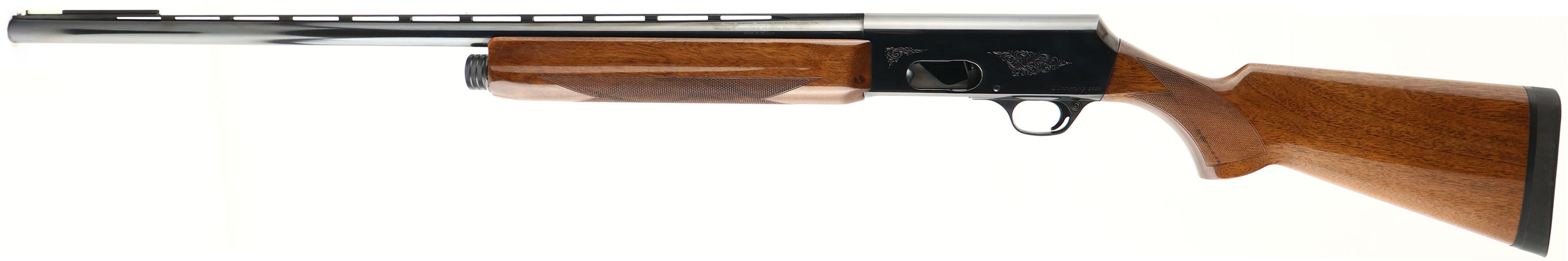BROWNING, Model 2000 (B-2000), 12 GA. MFG. 1974, SN: 29140C47, Semi-Auto, Made in Belgium, 2 3/4'', MOD, 28'' ventilated ribbed barrel. Early first year production shotgun that was fully built in Belgium, whereas later years the parts were made in Belgium & assembled in Portugal. The original checkered & flat pistol grip walnut stocks are excellent. There are a couple tiny handling blemishes to the original glossy finish. The original metal black finishes rate 98% overall, on both barrels & receiver. Bore is excellent, Silver mid & front bead, with an additional green fiber optic rail mounted on rib in front of silver bead. Stock carries a solid recoil pad. LOP 14 1/4'' over pad. Excellent high original condition. FFL Req. - Value: 600 to 1000