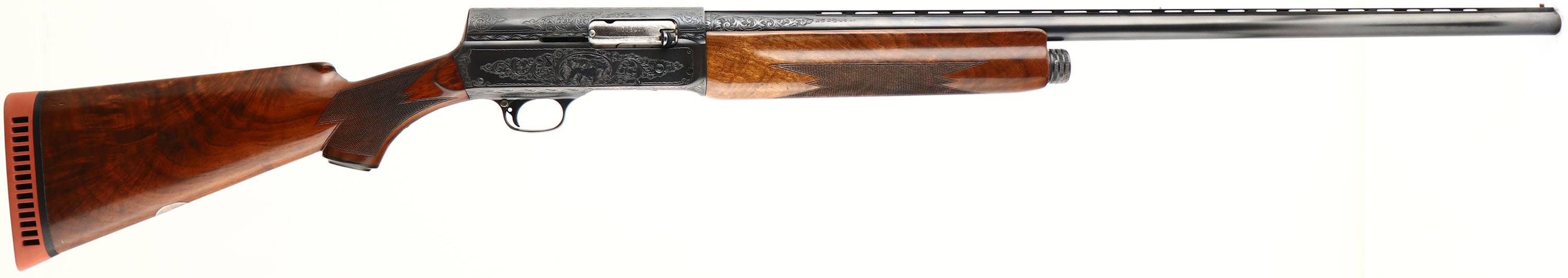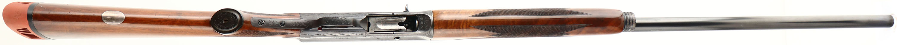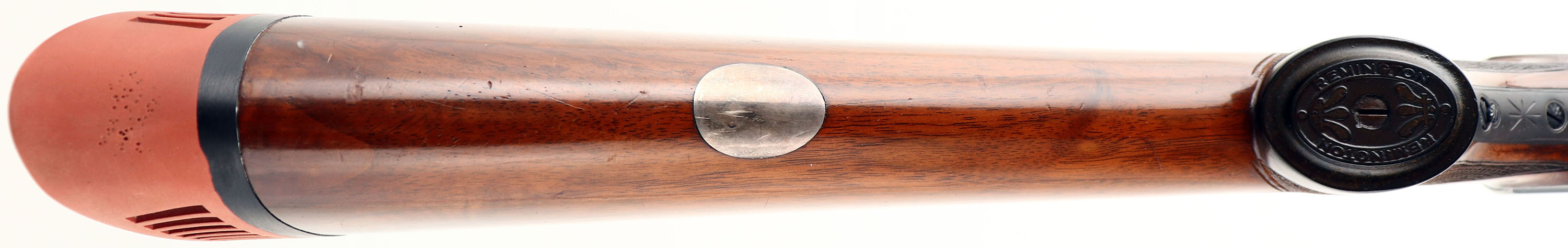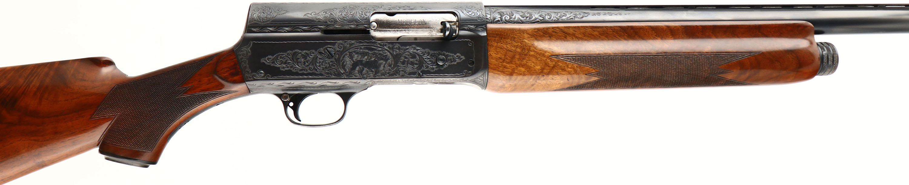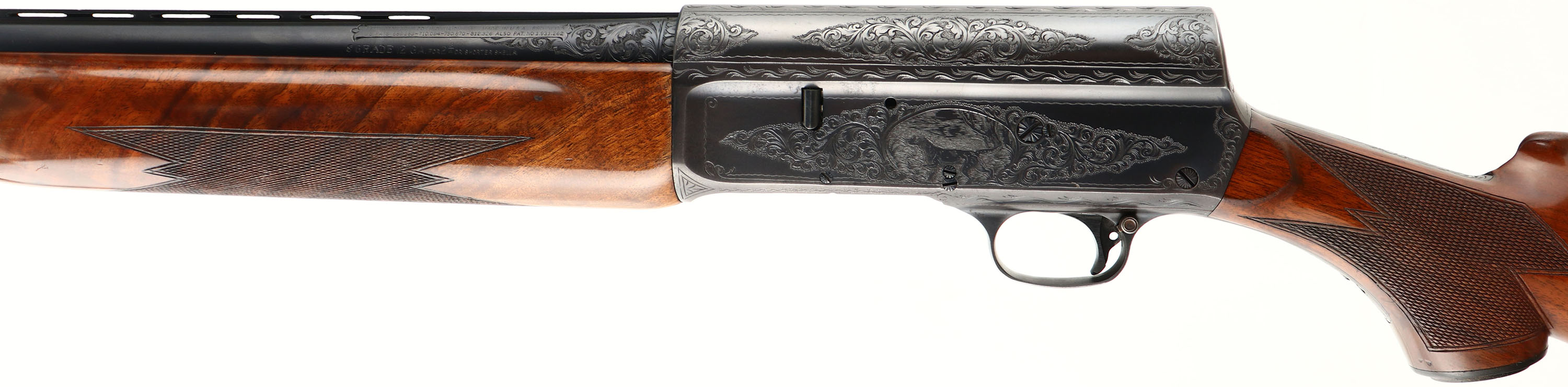 ENGRAVED Remington Model 11, ''E'' Grade, CAL: 12 GA, MFG: 1905-47, SN: 780850, Semi-Auto Shotgun, Choke: F, 30'' Ventilated matted rib barrel. Custom shop ''E'' grade or sometimes referred to as a No. 5 Expert Grade. The special order shotgun has high grade walnut wood stock & forearm, which are excellent, with very nice figure to the grain. Factory checkering is 22 lines-per-inch. The stocks carry the original factory finish, with minor handling scuffs, scratches & dings. The stock carries a cap on the pistol grip & an inlaid silver initial plate in the belly of the stock, typically found on Expert (''E'' grade) guns. The original metal blue finish rates 95% on the barrel, 90% on the receiver. The large receiver side panels are covered with what Remington marketed as ''rich scroll hand engraving & game scenes''. The left side of receiver is engraved with a large English Setter on the left & a Geman Shorthair on the right, both in hunting scenes. The base of trigger guard, tangs & first 5'' of barrel all display wonderful ornamental, scroll or floral engravings. The bore is excellent. The ventilated, matted rib holds a single front sight bead. Buttstock carries a ventilated HAWKINS red rubber recoil pad. LOP: 14 3/4'' overpad. A very nice example of an engraved custom shop shotgun. FFL or C&R Req. - Value: 2500 to 4000