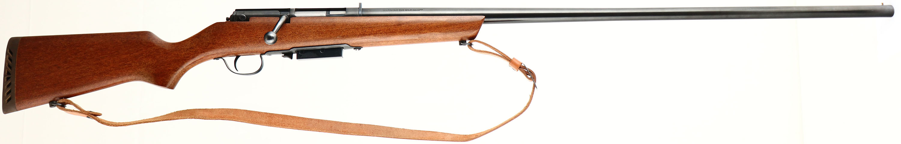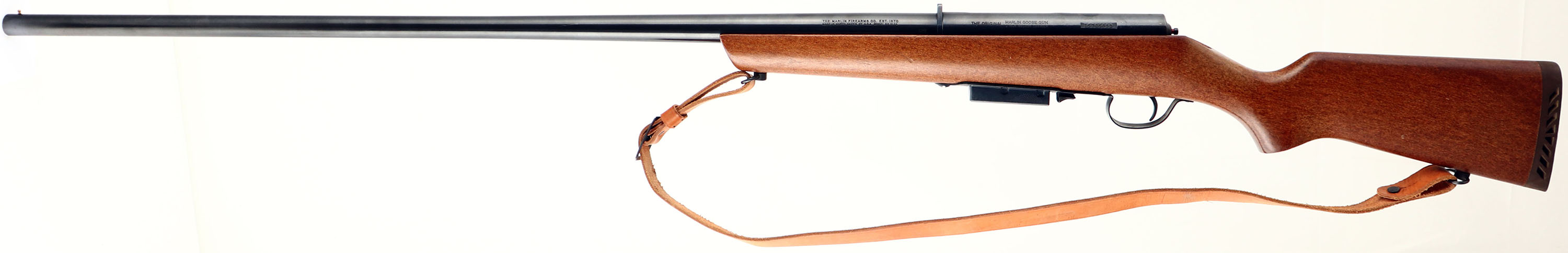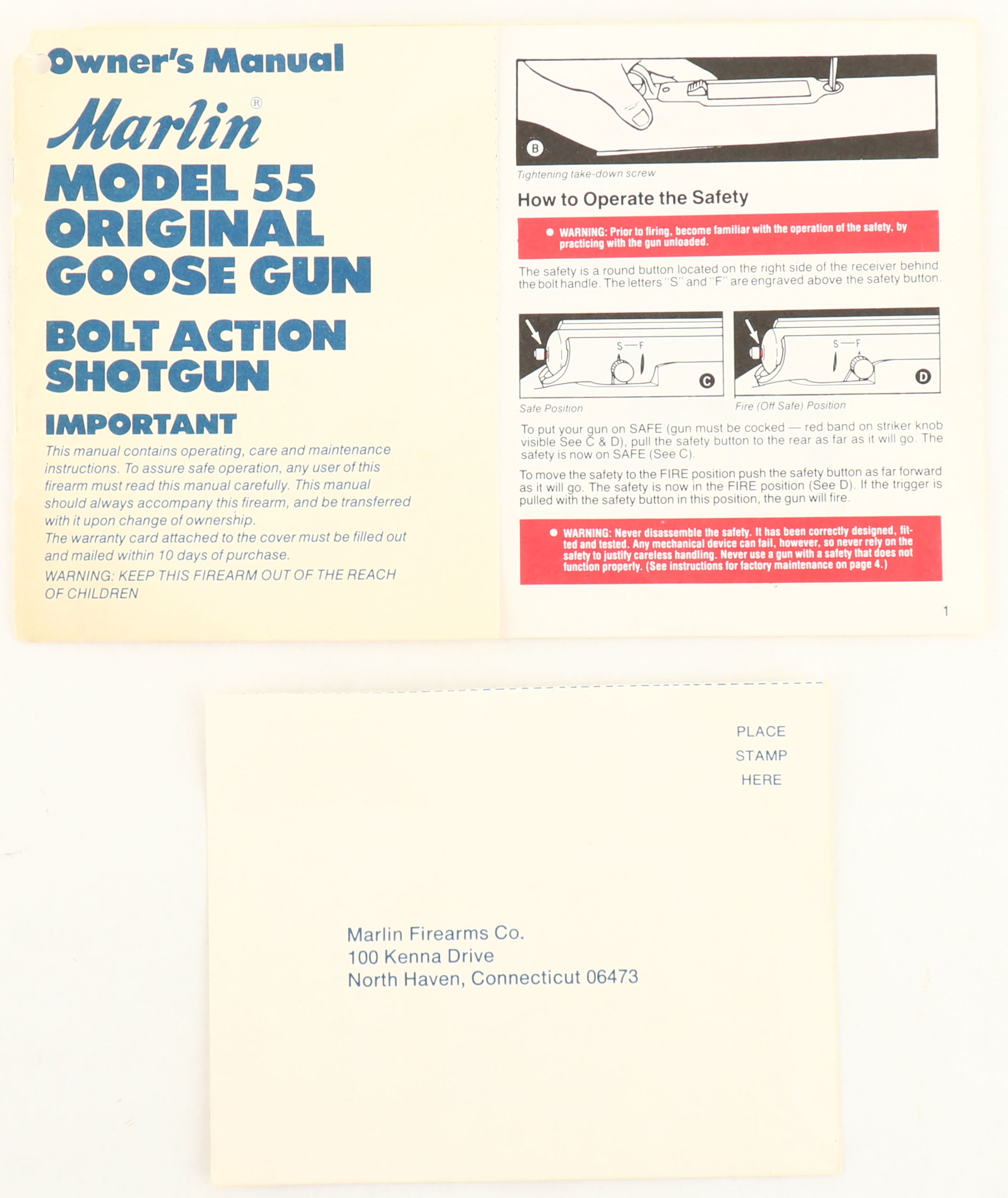 Marlin Firearms Co., The Original Marlin Goose Gun (Model 55), CAL: 12GA, MFG: 1968-88, SN: 15705899, Bolt Action Shotgun, 36'' barrel. The flat pistol grip wood stock is excellent. The original metal blue finish rates 98% overall. Bore is excellent. Fixed rear sight & bead front sight. Comes with leather sling & related paperwork. FFL Req. - Value: 200 to 400