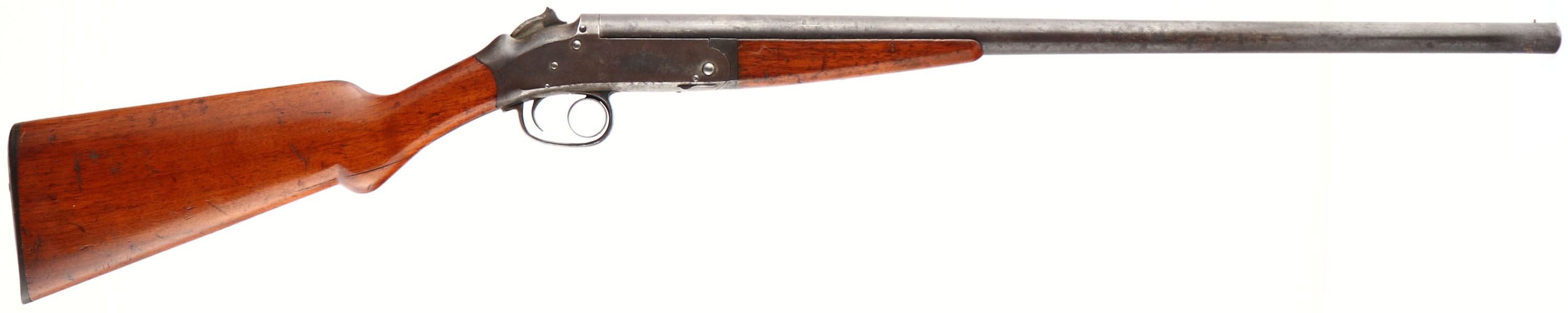 Iver Johnson Arms & Cycle Works, Model 1900 ''Ring Action'', CAL: 12 GA, MFG: 1905-08, SN: 49398, Break Action Single Shot Shotgun, 26 1/8'' barrel. The Iver Johnson Ring Action was the Model of 1900. Patent Number 697,516 was issued April 15, 1902 to O. F. Mossberg for a firearm lock, & assigned to Iver Johnson Arms & Cycle Works. Old advertisements show the asking price was $7.25. The round knob pistol grip wood stock & forend are very good & solid. There are numerous contusions, scrapes & scratches to the wood, which carries an added high gloss finish. The metal blue finish on the barrel rates 20%, with the majority toned to gray/brown patina, & with small areas of rust pitting grey. The case-hardened receiver has worn to metal grey, with brown patina & some remnants of case-colors in protected areas. Bore is very good, with bright & clean. The barrel holds a single front brass bead. Stock carries a I.J plastic buttplate. FFL or C&R Req. - Value: 150 to 300