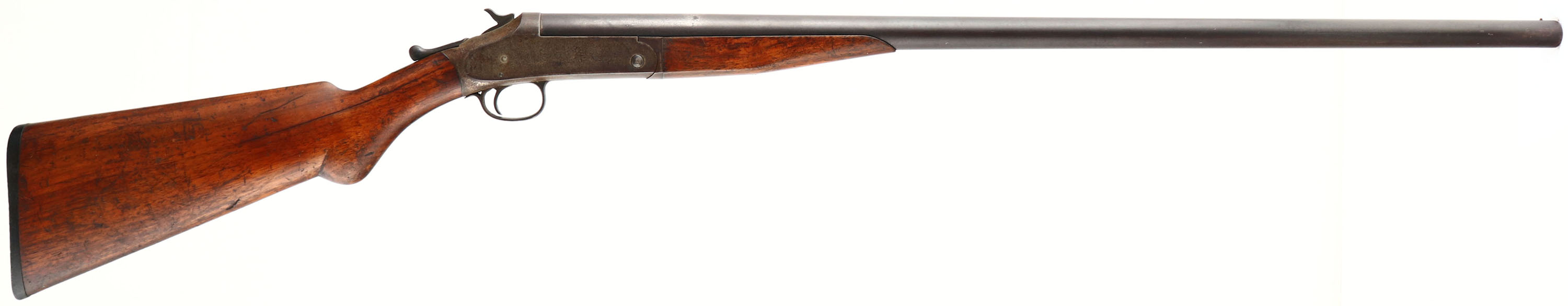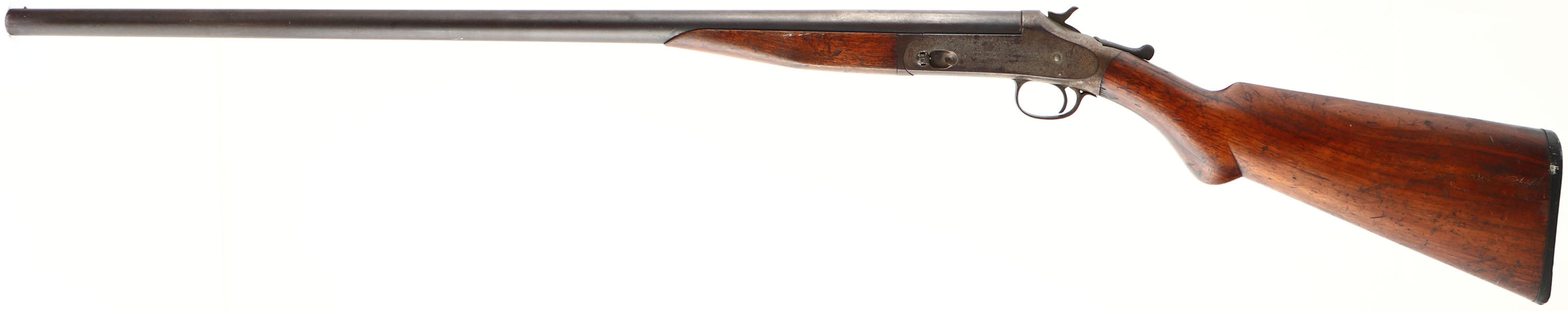 Harrington & Richardson Arms Co. Model 1901 Single Break Shotgun, CAL: 12 GA, MFG: early 1900's, SN: A29081, FULL, 30'' barrel. The original round knob wood stocks are good & solid, despite a 6'' stress cracks running along each side of the wrist. There are numerous contusions, scrapes, nicks & scratches to the thin & worn original finish. The metal finish has worn & toned to a brown patina. The take-down pin is missing the take-down assist piece on the receiver. Bore is fair due to heavy use, but clean. Single front bead. Buttstock carries a checkered black plastic buttplate. FFL or C&R Req. - Value: 80 to 150