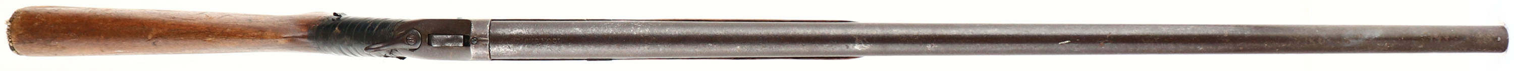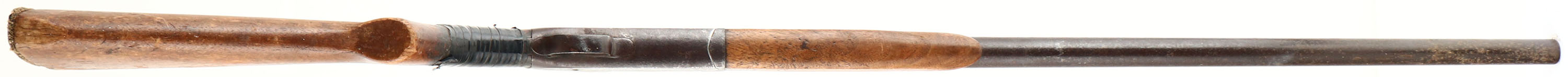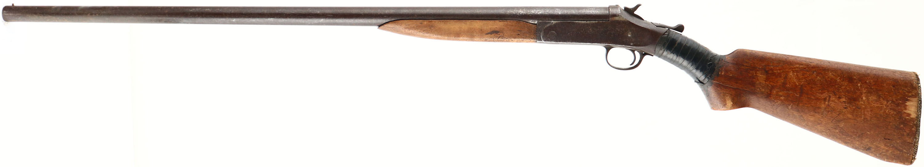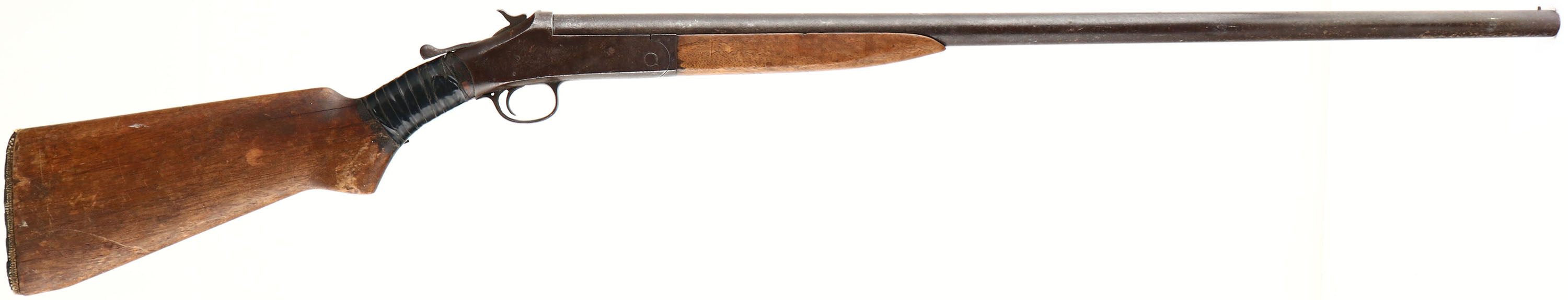 Harrington & Richardson Arms Co. Model Single Break Shotgun, CAL: 12 GA, MFG: early 1900's, SN: 217160, FULL, 30'' barrel. The original flat knob wood stocks are poor, with electrician tape wrapped around the wrist. There are numerous contusions, scrapes, nicks & scratches to the thin & worn original finish. There is a 1x1 1/2'' missing toe break & the buttplate has been replaced with a homemade rubber pad. The metal finish has worn to a rust brown, with rust pitting & speckling. Bore is fair due to heavy use, but clean. Single front bead. Might be a good project gun to cut down to legal length & throw into the pick-up. FFL or C&R Req. - Value: 40 to 80