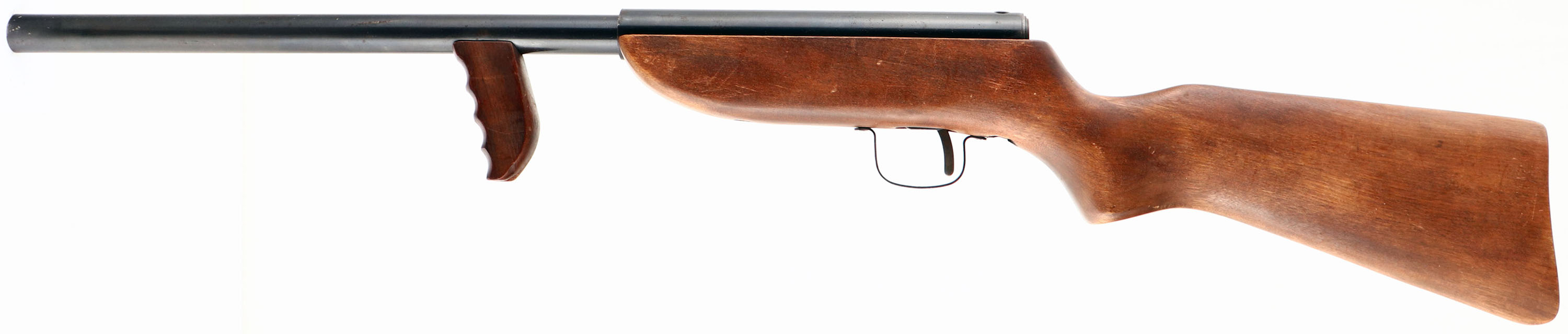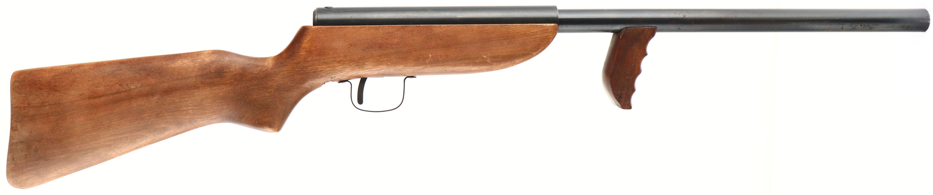 Richardson Industries, R-5 Philippine Guerrilla Gun Shotgun, 12ga Cal., MFG: 1940's-65, SN: 1185, 24'' Barrel, Based on the design of Philippine homemade fighting shotguns. These guns were introduced to the market following World War II, but never caught on in mass quantities & are fairly rare as a result. The weapon is fired by removing the barrel, dropping a shell into the barrel, replace the barrel, pull the trigger back & then forcefully pulling the barrel back into the sleeve & slamming the shell against the firing pin. The barrel has a ribbed slot that catches a pin connected to the trigger that is used to hold the barrel within the sleeve when not in use. Pulling the trigger back frees the barrel to be removed. The original square bulky stock is excellent, with few blemishes. The stock is stamped on the belly of the forend with the SN & ''Patent Applied For''. It carries no buttplate as they were produced without them. It has no sights. The bore is excellent. The blued outer finish is excellent, with some speckled rust or spotting. A fairly crude weapon, but this example is in excellent original condition & is fairly collectible because of their rarity. FFL or C&R Req. - Value: 250 to 600