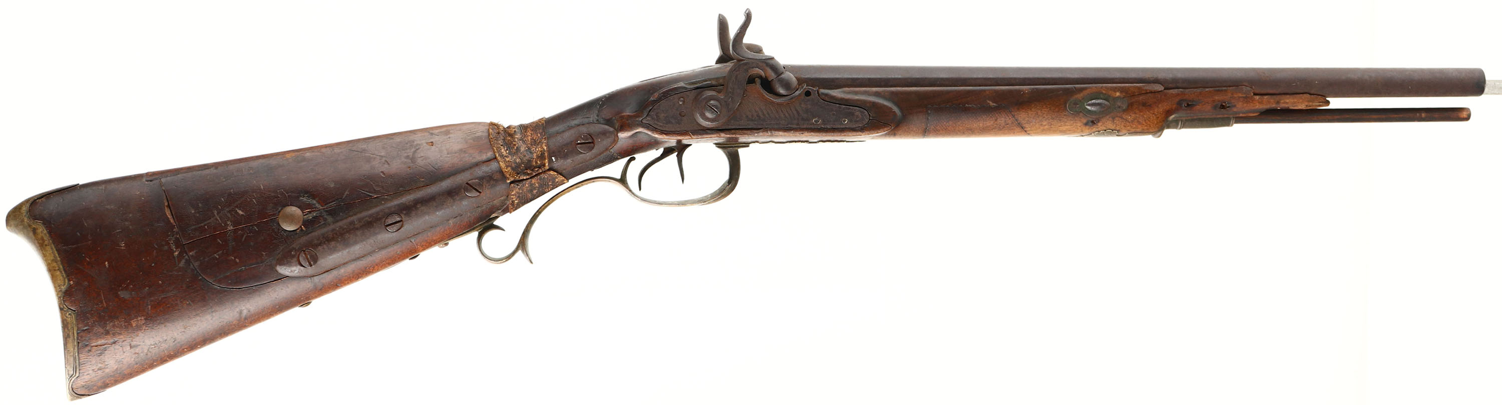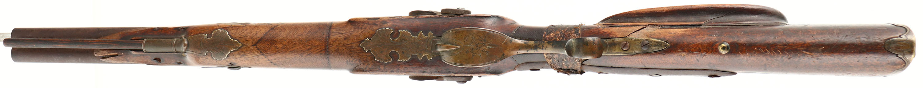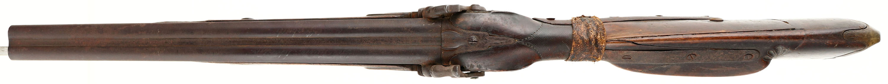 Tex-Mex Sawed off double barrel, originally made by Christian Schram of Offenbach, Hesse, Germany. Flintlock muzzleloader converted to percussion, .58 Cal (24 Ga), 16 3/4'' barrels. The stock is poor. Has many crack, chips & repairs from a long & hard life in the old west. Has ornamental brass fittings. Raw hide repair on wrist. Faint outline remains of checkering on the forend & wrist. metal has toned to a rust brown patina. The top of the barrel is marked ''CHRISTIAN SCHRAM'', ''OFFENBACH HESSE'' in German script. the marked is heavily worn/faded & is barely legible. Bottom of trigger guard is marked with a crossed cannons & arrow logo. The hammers, lockplate, lower & upper tangs have worn ornamental engravings. The bores are poor, both are dark with rust & pitting. No sights. Brass ornamental buttplate, toning dark with patina. Gun has ramrod. A great wall hanger with a lot of history, if only the gun could talk. Muzzleloader/Antique, No FFL Req. - Value: 100 to 500