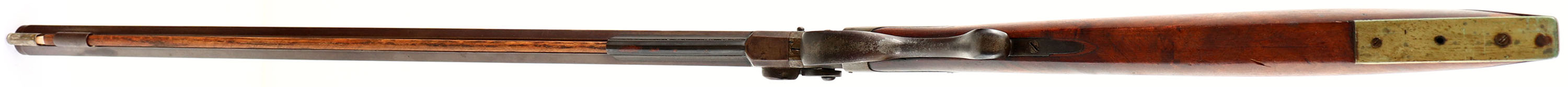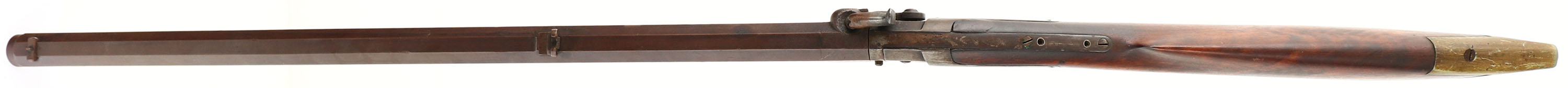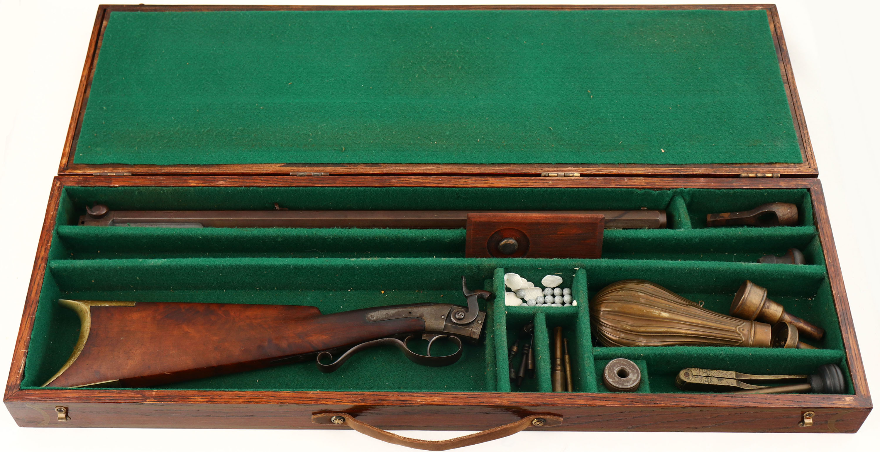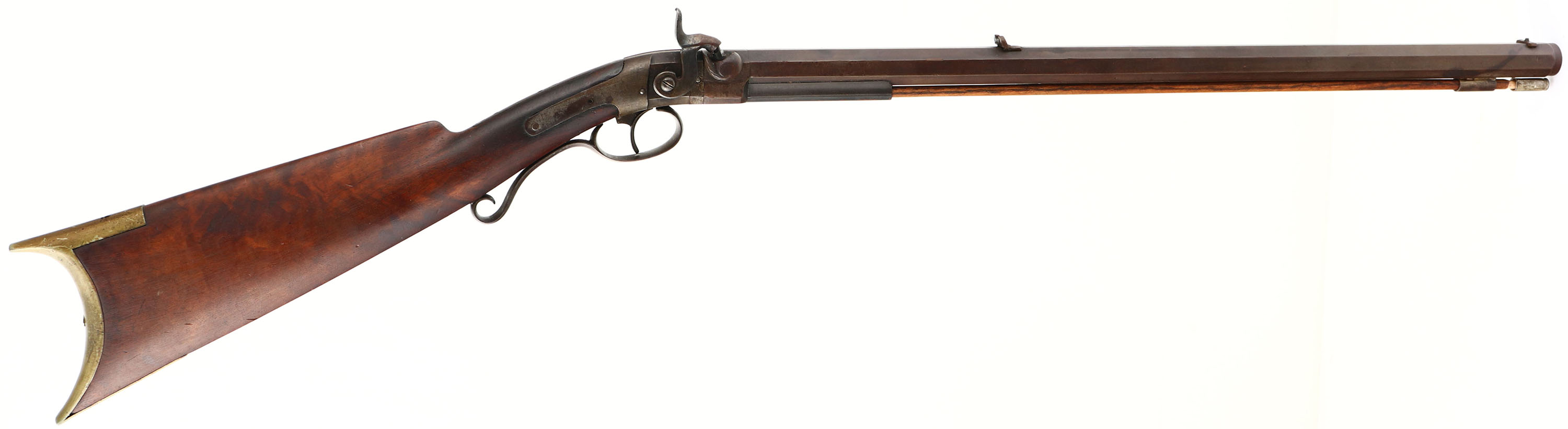 CASED, Unmarked, Mowery Style, Take down Muzzleloader, Cal: .34, MFG: circa 1850's-60's, S/N: None, Percussion, 22 3/4'' octagon barrel, turns round just at the muzzle. The straight wrist walnut buttstock is very good as being lightly sanded & oiled. Metal is slightly proud to wood around the upper tang & toe of stock. The end of the bottom tang & left tang of wrist, have small inlaid wood repairs. The metal has toned to a mixture of brown patina, orange rust patina, & spots of light pitting. Only markings on gun are at the muzzle end & read ''340'', ''L''. The bore is very good, near excellent. Its bright with one spot of roughness/ light pitting at the muzzle. the barrel holds a small barley corn front sight with a fixed U-notch rear. Stock carries a brass crescent moon buttplate, has spots of patina & dings. Rifle has ramrod. Rifle comes with custom a oak case with green cloth interior. Red bullseye painted onto top of case. Rifle fits into case broken down. Inside the case is a extra ram rod, bullet starter, powder horn with two top spouts, brass bullet mold for both round & conical bullet, take down tools, a couple round balls, a set of cleaning jags, & a few other Misc. tools. A nice example of a seldom seen, antique take down ''Squirrel Gun''. Muzzleloader/Antique, No FFL Req. - Value: 1000 to 2500