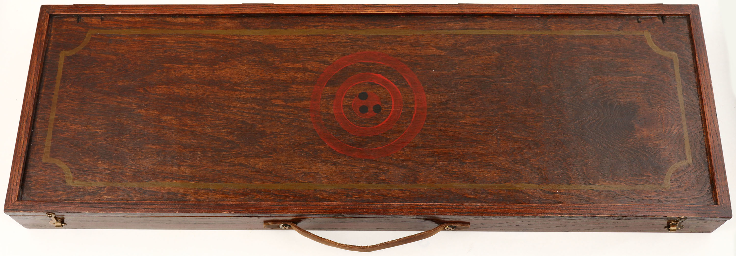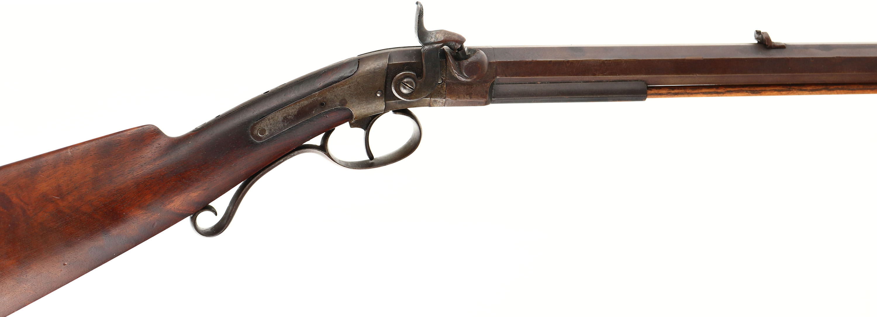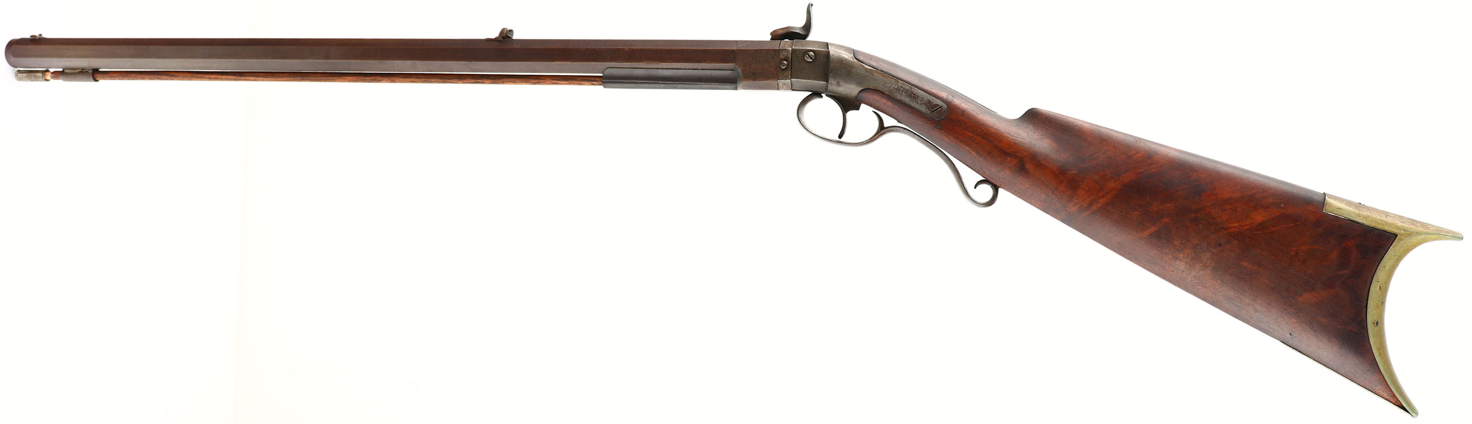 CASED, Unmarked, Mowery Style, Take down Muzzleloader, Cal: .34, MFG: circa 1850's-60's, S/N: None, Percussion, 22 3/4'' octagon barrel, turns round just at the muzzle. The straight wrist walnut buttstock is very good as being lightly sanded & oiled. Metal is slightly proud to wood around the upper tang & toe of stock. The end of the bottom tang & left tang of wrist, have small inlaid wood repairs. The metal has toned to a mixture of brown patina, orange rust patina, & spots of light pitting. Only markings on gun are at the muzzle end & read ''340'', ''L''. The bore is very good, near excellent. Its bright with one spot of roughness/ light pitting at the muzzle. the barrel holds a small barley corn front sight with a fixed U-notch rear. Stock carries a brass crescent moon buttplate, has spots of patina & dings. Rifle has ramrod. Rifle comes with custom a oak case with green cloth interior. Red bullseye painted onto top of case. Rifle fits into case broken down. Inside the case is a extra ram rod, bullet starter, powder horn with two top spouts, brass bullet mold for both round & conical bullet, take down tools, a couple round balls, a set of cleaning jags, & a few other Misc. tools. A nice example of a seldom seen, antique take down ''Squirrel Gun''. Muzzleloader/Antique, No FFL Req. - Value: 1000 to 2500