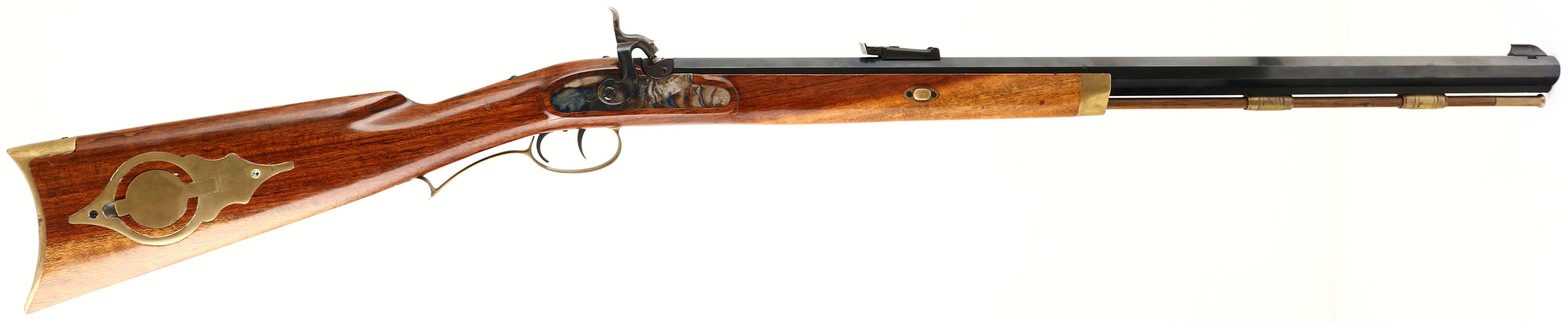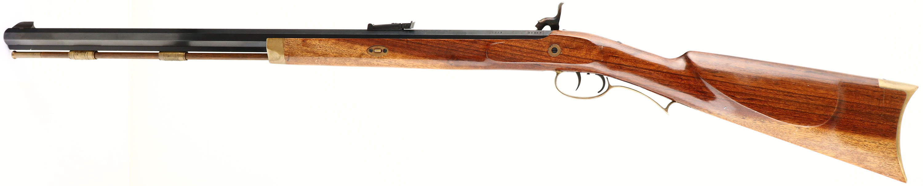 Armsport (Italian), Model: Hawken (unmarked), Cal: .50, MFG: modern, S/N: 11913, Percussion Muzzleloader, 29'' octagon barrel. The straight wrist, cheeked wood stock is excellent with a few minor nicks & scratches. brass patch box in right cheek of stock, has replacement percussion nipple, & brass cleaning jag inside. The blued metal finish on the barrel rates 92% with spots of light wear & light patina speckling, concentrated at the right side of muzzle. Case hardened finish remains on the lock plate & hammer, with small spots of wear & speckled patina. The bore is excellent. Its bright with little to no wear. The barrel hods a beaded blade front sight with a adjustable U-notch rear. Stock carries a brass crescent moon buttplate. Rifle has ramrod. Double set trigger. Muzzleloader, No FFL Req. - Value: 300 to 500