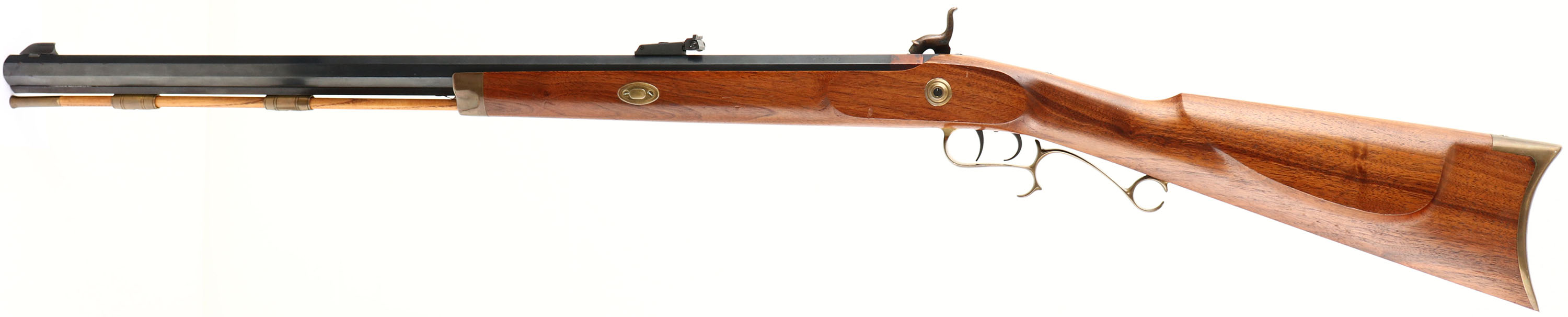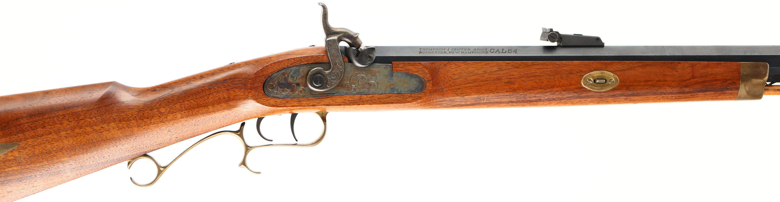 Thompson Center Arms, Model: Hawken (unmarked), Cal: .54, MFG: modern, S/N: K229642, Percussion muzzleloader, 28 7/8'' octagon barrel. The straight wrist, cheeked stock is excellent with a few minor nicks & scratches. has brass patch box in right cheek of stock. The blued finish on the barrel rates 97% with spots of light wear & light patina speckling. Lock plate & hammer retain almost full case hardened finish. The bore is excellent. Its bright with little to no wear. The barrel holds a beaded blade front sight with a adjustable U-notch rear. The stock carries a brass crescent moon buttplate. Rifle has ramrod. Double set trigger. Muzzleloader No FFL Req. - Value: 300 to 500