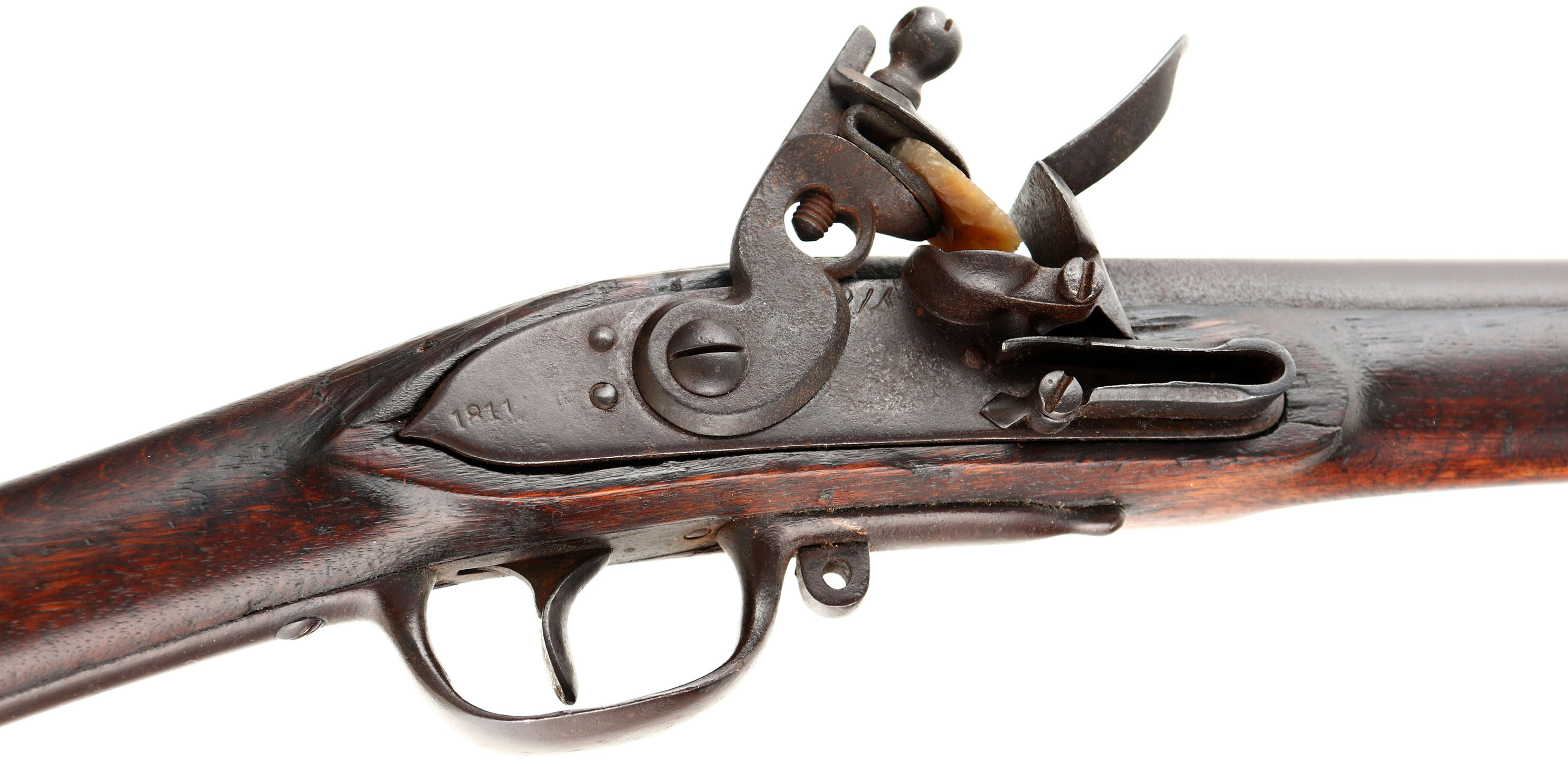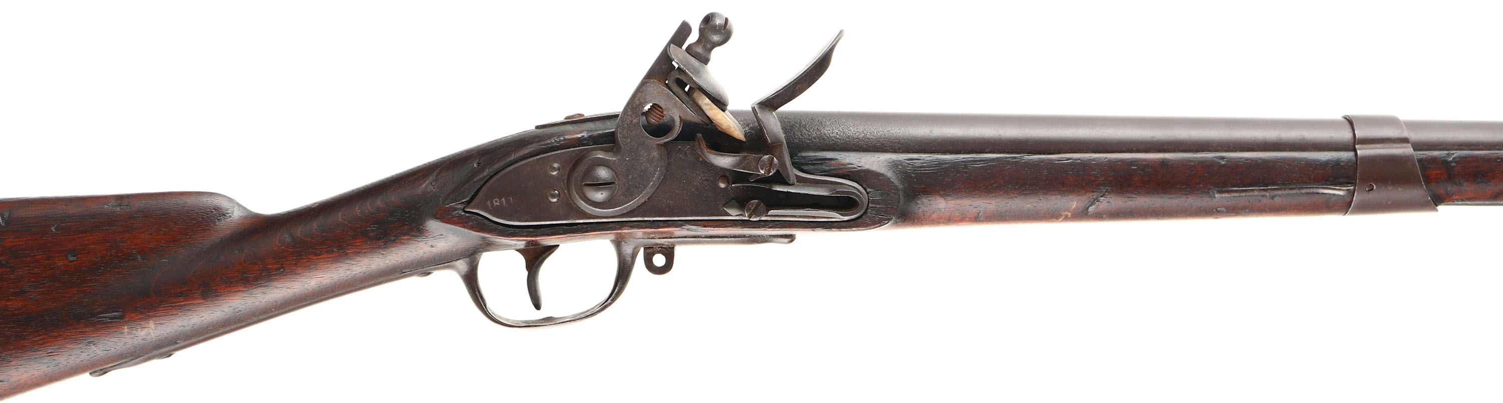 CONDITION: the straight wrist walnut stock is good with small chips, dings, cracks, & scratches. stock has darkened from added oils. stock has shrunk over time leaving the metal proud to the wood around the buttplate & wrist. wood fill repair on the right of the wrist in between the lock plate & barrel tang. the left flat of stock, opposite of lock plate, is marked ''WESTPHAL'', likely the stock maker. The barrel channel on the stock is marked ''1811''. The metal has completely toned to a brown patina. Metal has multiple ding marks & cleaned pitting scars at the rear of the barrel. The markings on the top of the barrel are heavily worn & are just barley visible. The markings appear to read ''PM'', ''US 1811''. The lock plate is marked ''1811''. The eagle over Springfield marking is heavily worn but slightly visible. The bore is poor. It is dark with rust & pitting. The front sight is on the front barrel band, the stud at the end of the barrel is the bayonet lug. The stock carries a iron buttplate, toned to a brown patina. Rifle is missing the sling loops but has the ram rod. Antique, no FFL Req. - Value: 1000 to 2500