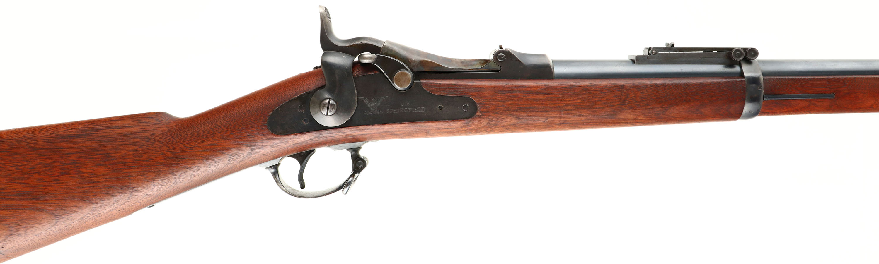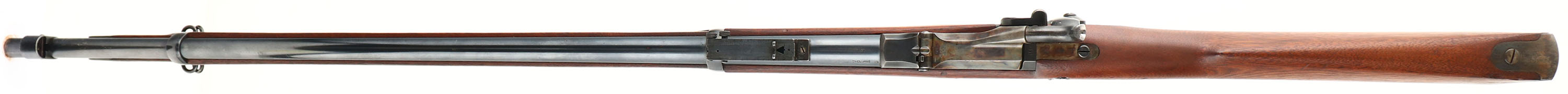 Springfield Armory, Model: 1884 Trapdoor (1873 marked breech), Cal: .45-70, MFG: 1887, S/N: 346806, single shot rifle, 32 '' barrel. The straight wrist walnut stock is excellent with only small minor nicks, dings, & scratches. Left side of wrist has a ''SWP'', ''1886'' in box cartouche. The belly of the stock is marked with the circle ''P'' proof cartouche. The blued metal finish on the barrel rates 90% with concentrated wear at the muzzle. The case-hardened finish on the breech block rates 90% with light wear & patina speckling. The top of the breech block is marked ''US'', ''MODEL'', ''1873''. Springfield would use up old 1873 marked breech blocks on the new 1884 Model. 1884 marked breech blocks would start coming out mid to late 1887. The rear of the receiver is marked with the S/N. the left side of the barrel is marked ''V'', ''P'', over eagles head, ''R'', ''P''. the top of the barrel is marked ''A''. the lock plate is marked with the American great eagle, ''U.S.'' ''SPRINGFIELD''. The bore is excellent. Its bright with very little wear. The barrel holds a blade front sight with protective hood, & a Buffington ladder rear sight. The stock carries a blued steel buttplate, has wear & small spots of patina. Rifle has both sling loops & the third stacking swivel. Rifle also has cleaning/clearing rod. A beautiful, high condition trapdoor Springfield. Antique, no FFL Req. - Value: 1000 to 2000
