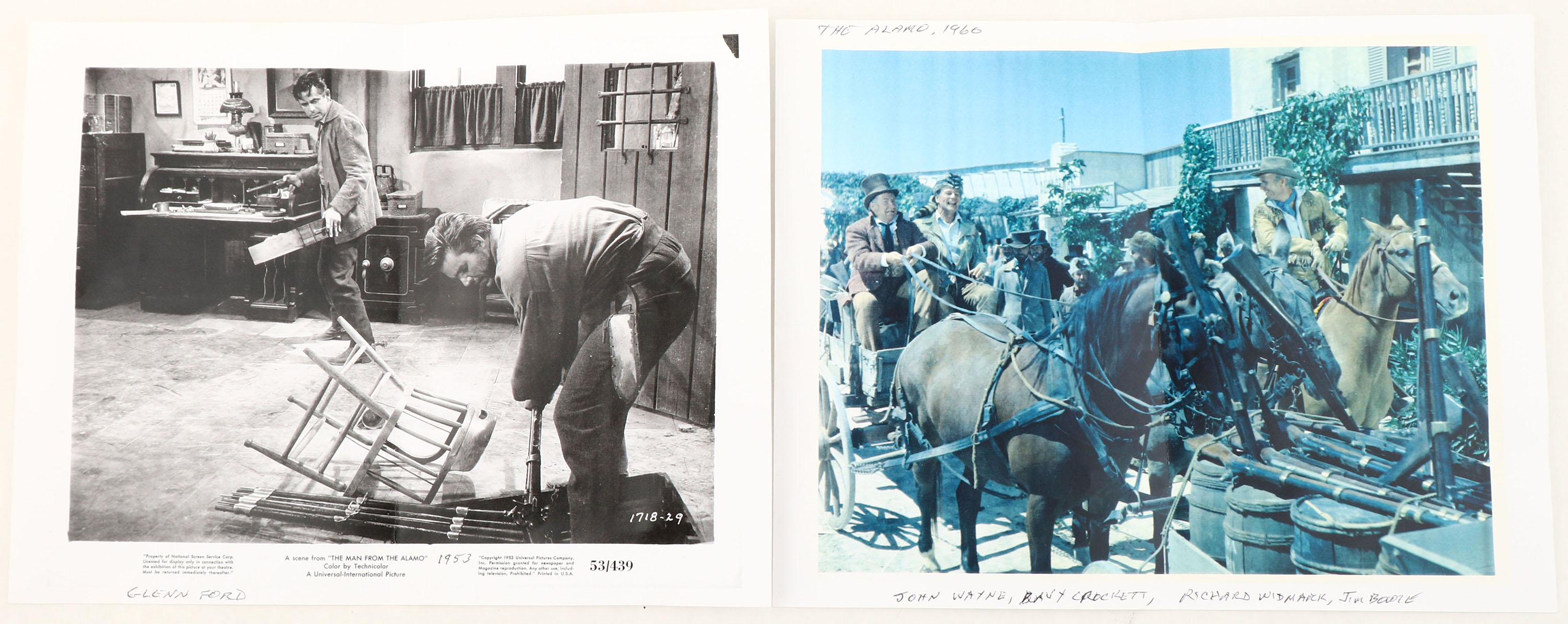 HISTORY: This is a surplus trapdoor rifle that was bought by a prop house & modified by them to look more like a flintlock rifle but still fire blank cartridges. They could be seen with different amounts of modifications, some were left in their full length, & some were chopped down into carbines. This rifle has beautiful brass furniture. These were prominent in the movies The Man from the Alamo (1953), & John Waynes The Alamo (1960). Included with this rifle are two still photos from those movies were these modified trapdoors can be seen.