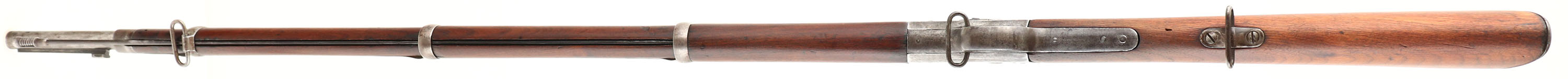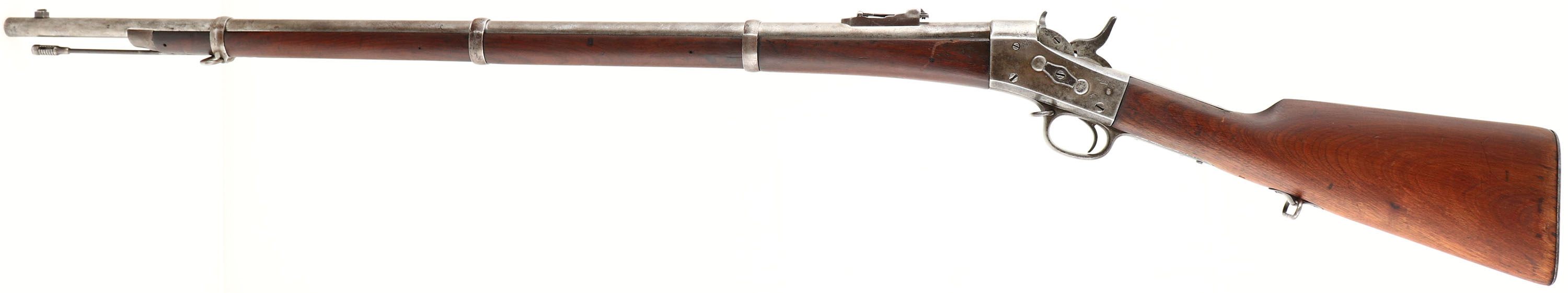 CONDITION: The two-piece straight wrist stock is very good. Stock has small nicks, dings, & scratches. Wood is worn in spots & metal is proud to wood in spots around the tangs & buttplate. The metal has worn gray with dark patina forming in spots. The upper tang is marked with a Remington two-line address, ''1864, &''1866'' patent dates. The inside of the tangs is marked ''B35695''. The left side of the barrel is marked ''B''. The barrel bands are marked ''B'' on the right side. The bore is very good. Its bright with light roughness. The barrel holds a small barleycorn front sight with a stepped base/ladder V-notch rear sight. Ladder is missing elevator & base is missing rear screw. The stock carries a steel buttplate, toned to a mix of gun metal gray & brown patina. The rifle has both sling loops & the cleaning/clearing rod. Antique, no FFL Req - Value: 500 to 1000