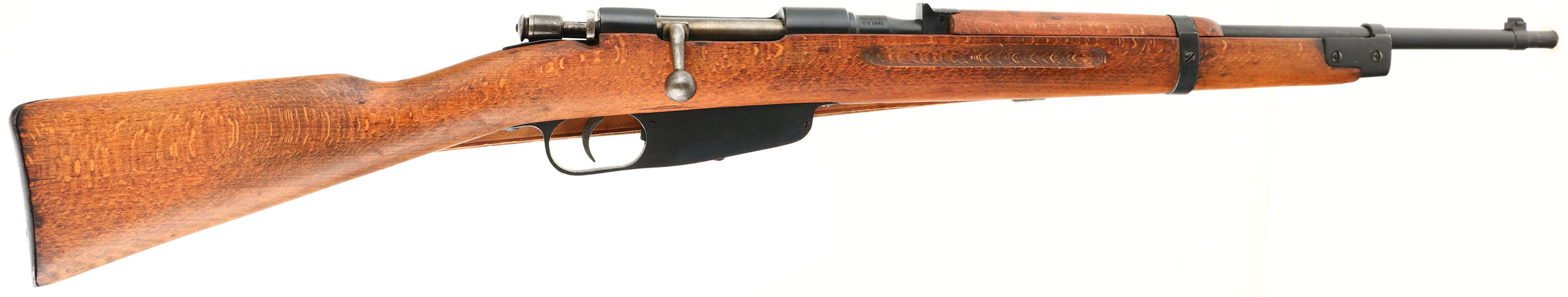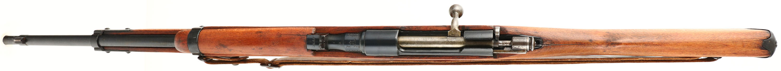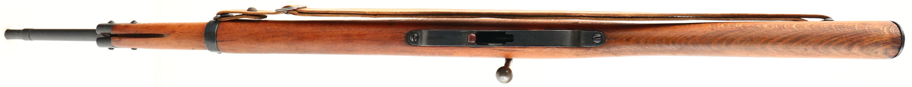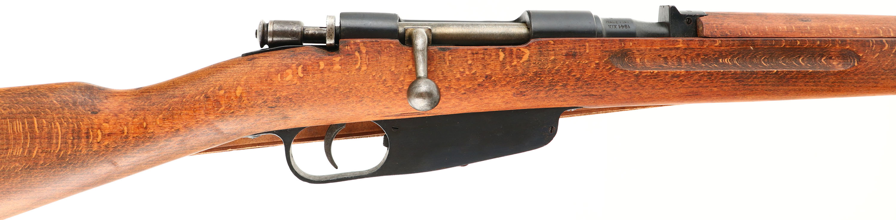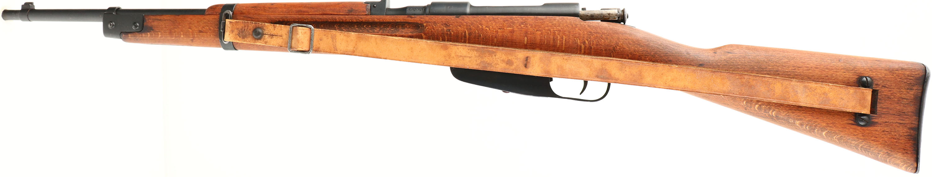 R.E. Terni, Model: M91/30 Carcano, Cal: 6.5x52mm, MFG: 1941, S/N: BT-2027, Bolt action rifle, 21 1/2'' barrel. The straight wrist beechwood stock is excellent as being sanded & oiled. There is a 1 1/2'' crack on the upper handguard. Metal is proud to the wood around the buttplate, upper tang & trigger guard/magazine. No visible cartouches on the stock. The blued metal finish rates 95% overall with slight haziness. The left side of the receiver has one small proof stamp. The rear of the barrel is marked with Italian proofs, the S/N, ''ITALY'', crown over ''RE'', ''TERNI'', ''MADE ITALY'', ''1941 XIX'', ''X'', ''M''. The top of the rear sight is marked ''CAL.6.5''. The bolt handle is marked ''S'' on the top, & the Fabbrica Nazionale D'Armi Subcontractor mark on the bottom. The bore is very good. Its bright with strong rifling but has spots of light roughness. The barrel holds a wide square post front sight with a fixed V-notch rear sight. The stock carries a steel trapdoor buttplate, toning to a brown patina. Rifle has sidle sling mounts & comes with a leather sling. FFL or C&R Req. - Value: 250 to 500