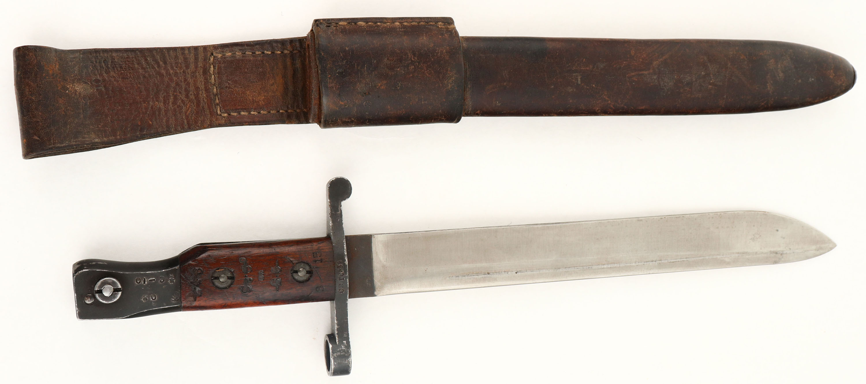 CONDITION: The semi-pistol grip wood walnut stock is very good with small nicks, dings, scuffs & scratches from use/wear. The bottom of the wrist is marked ''US'' & the S/N. the right cheek of stock is line out regiment & unit markings, as well as a Roundel cartouche marked with a crown at the top, ''D'' arrow ''C'' in the middle, & ''QUEBEC'' on the bottom. To the right of the Roundel is ''3*'' over ''II.'', ''842/1909'', ''RD''. The metal has mostly toned to a brown patina, with spots of gray, & thinned finish on the barrel. The left side of the receiver is marked ''ROSS RIFLE CO QUEBEC.CANADA.1905.'', ''PATENTED''. The bore is very good. Its bright with spots of light roughness. The barrel holds a hooded, square post front sight with a V-notch/aperture, flip up ladder rear sight. The stock carries a steel trapdoor buttplate. Has worn gray with spots of patina. Nothing inside trapdoor. Rifle has three sling swivels with a stacking loop. Comes with a Ross bayonet 1907 patent date, with sheath & frog. Bayonet grips have a bunch of crossed out numbers, with numerus other markings on the guard & pommel. FFL or C&R Req - Value: 1000 to 2000