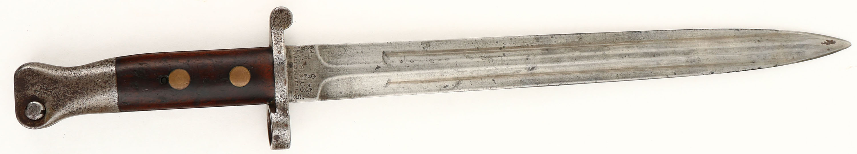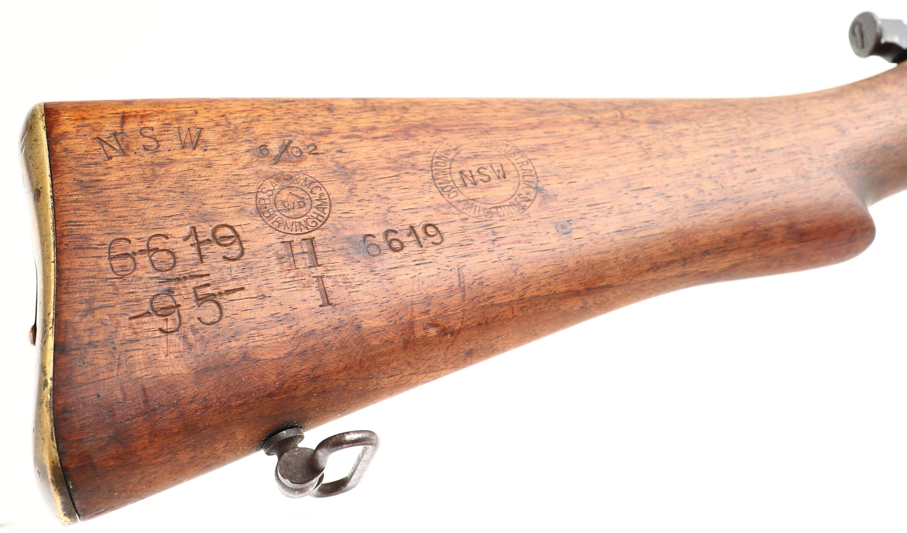 CONDITION: The semi-pistol grip wood stock is very good. The buttstock has been professionally cleaned up, with all markings looking untouched, and does not appear to of been sanded. The forend of the stock has a bunch of dark stains. Thew whole stock a various small nicks, dings, & dents from use/age. The right cheek of the stock is marked ''N.S.W.'', ''6/02'', lined out ''6619'', & ''95'', BSA WD roundel over ''II'', over ''I'', ''6619'', NSW roundel cartouche marked ''COMMONWEALTH AUSTRALIA MILLY FORCES'' around ''NSW''. The stock just ahead of the magazine is marked with a worn ''DP'' stamp. The blued metal finish rates 60% on the receiver with wear, scratches, & parts toning brown, the dust cover & a few spots of the receiver has rust speckling. The blued finish on the barrel rates 80% with spots of wear & rust speckling. The right side of the wrist band is marked with a crown over ''VR.'', ''B.S.A.&M.Co.'', ''1895.'', ''II.''. The left side of the receiver band is marked with a worn cross sword proof. The right side is marked with the S/N & a small proof, the S/N is partially obliterated with scratches/cuts, still partially visible. The top of the barrel is marked with a barely visible stacked rifles over ''B.S.A.'' logo. A bunch of small parts marked with small proofs like the mag, barrel bands, etc. S/N matching bolt. The bore is good. Its bright with consistent light roughness throughout & thinned rifling. Correct 7 groove Metford rifling. The barrel holds a small square blade front sight with a flip up ladder, V-notch rear sight marked 6 to 17. Rifle also still has its early flip up volley sights on the left side of the gun. The stock carries a brass trapdoor buttplate, bras has spots of patina. Nothing inside trapdoor. Rifle has both sling loops & third stacking swivel. Has a cleaning rod. Rifle comes with correct P1888 bayonet, MK I 2nd type, Sanderson MFG, base of blade marked with many proofs & late 1890s dates. A nice example of a typical Boer long-lee that saw use with British & Australian forces. ANTIQUE No FFL Req - Value: 800 to 1600