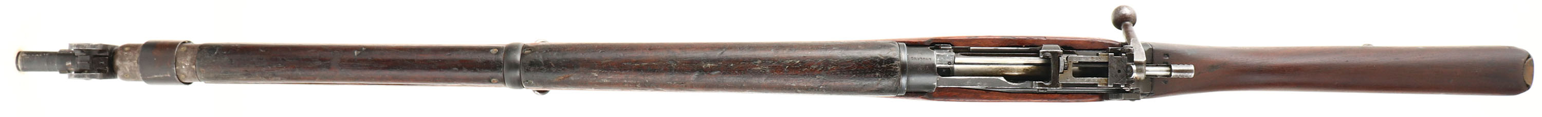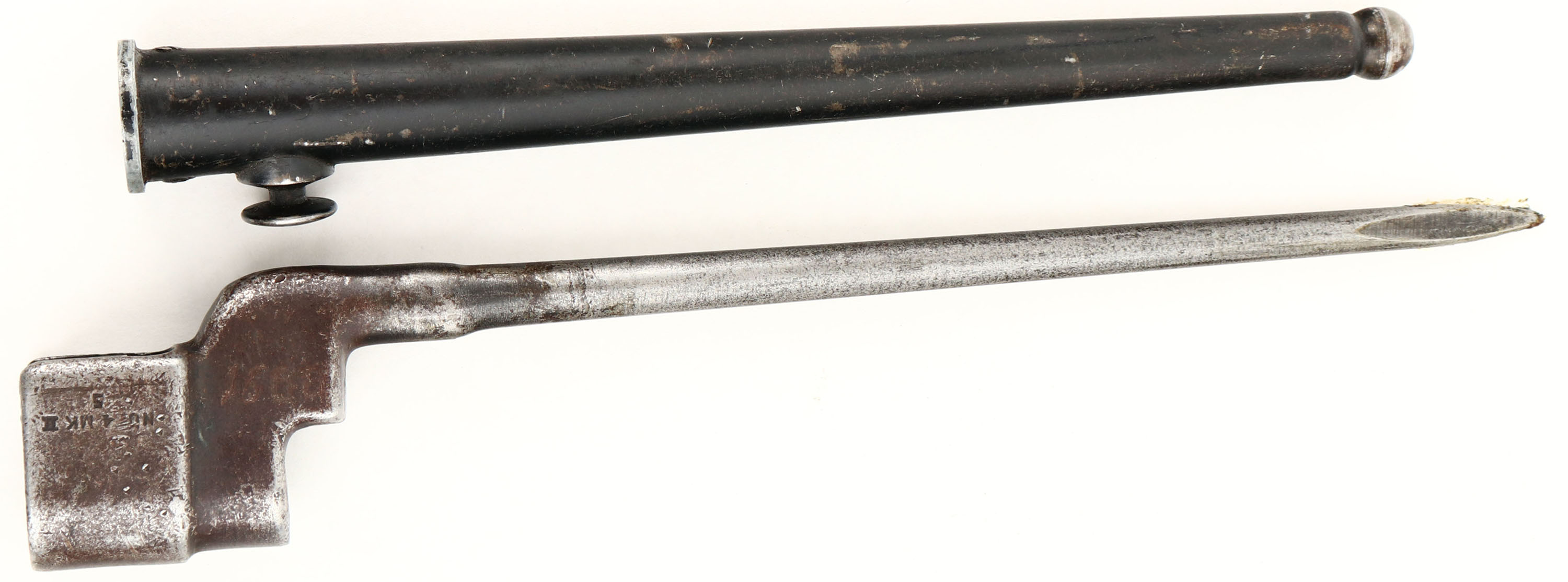 Condition: The two-piece wood stock is very good with nicks, dings, chips, & scratches from use/age. The top of the wrist is marked ''4035'', the bottom of the wrist is marked with a worn stamping over ''N2'', over a broad arrow. The bottom of the forend is marked ''S.I''. the front barrel band is missing a piece & is held on with a piece of wire. The black phosphate finish rates 85% overall with areas of thinning & patina speckling. The left side of the wrist band is marked with the S/N, ''S'', ''1942'', & a small flaming bomb. The left side of the receiver is marked ''FTR'' over ''M'', ''No4MkI*''. The top of the receiver band is marked ''A'' over ''19'' in parenthesis, ''ENGLAND'' & a British crown proof. The right end of the barrel is marked with more British import/proofing marks. S/N mismatched bolt ''47C3044''. The bore is excellent. Bright with no visible roughness. 5 groove rifling. The barrel holds a square post front sight. With a receiver mounted, flip up aperture real sight, marked 2 to 13. The stock carries a brass trapdoor buttplate, has black plastic oiler bottler inside. The rifle has both bottom sling loops. Rifle comes with period correct canvas sling, & a savage made No.4 MKII bayonet & sheath. A very nice US made SMLE. FFL or C&R Req - Value: 300 to 600