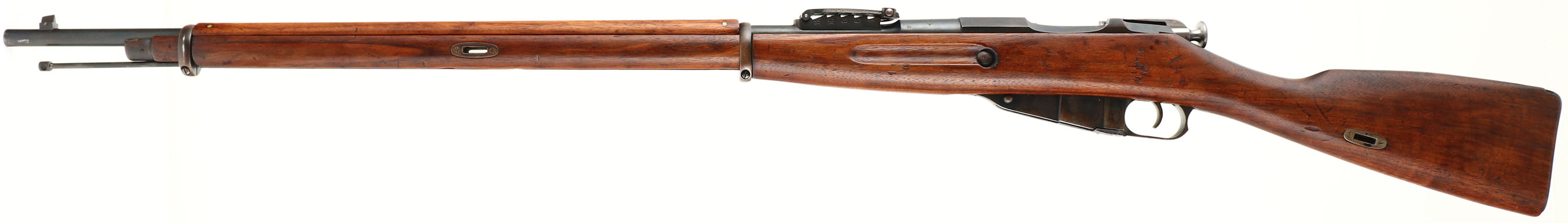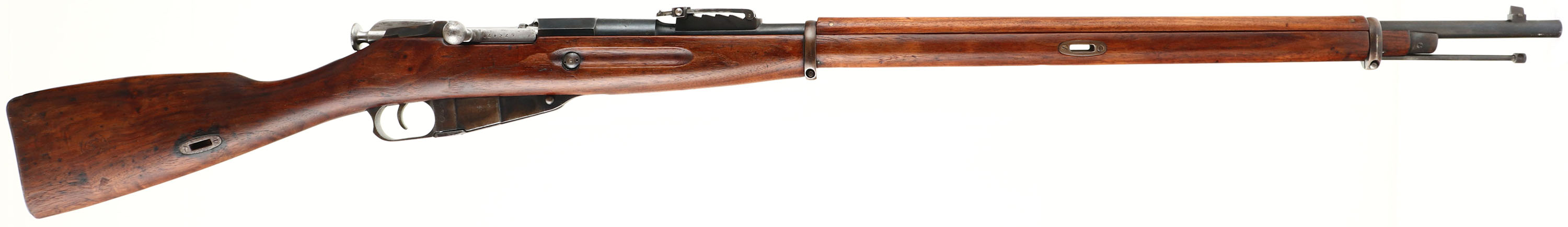 Remington, Model: M1891 Mosin, Cal: 7.62x54mmR, MFG: 1917, S/N: 572170, Bolt action rifle, 31 1/2'' barrel. The straight wrist walnut stock is very good as being lightly sanded & oiled. Stock has small nicks, dings, dents, & scratches. The right cheek of stock is marked with a lightly faded, Russian eagle Remington stock cartouche, indicating this is the original Remington stock. The bottom of the stock, Infront of the magazine, is marked with a faded flaming bomb over ''US'', US property mark. The metal has been re-blued & rates 85% on the barrel with spots wear & thinning. The receiver rates 80% with spots of thinning & brown patina. The top of the receive band is marked with a Russian imperial eagle over a Cyrillic ''P''. The top of the barrel is marked with a half buffed Russian eagle, ''REMINGTON'', ''ARMORY'', ''1917'', ''NO'', & the S/N. all parts are S/N matching, some S/N faint from cleaning. The bore is very good. Its bright with strong rifling, but has light roughness. The barrel holds a barleycorn front sight with a Konovalov rear sight. The stock carries a steel buttplate, toned brown with patina. Has both sling wells. Rifle has cleaning rod. Comes with correct Remington M1891 bayonet. FFL or C&R Req.