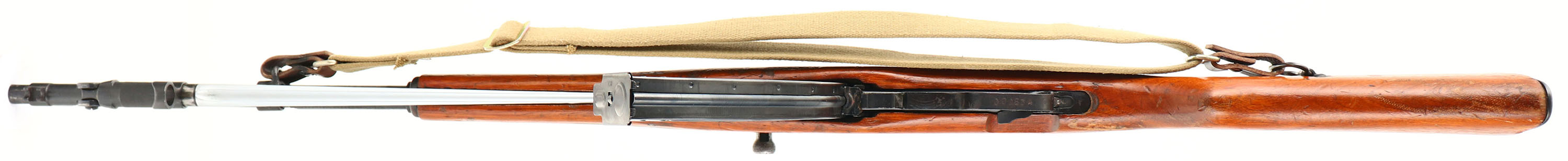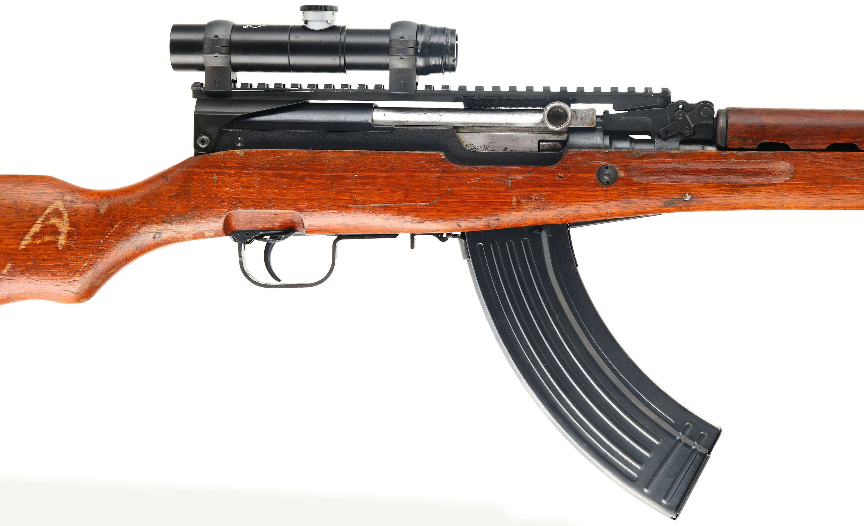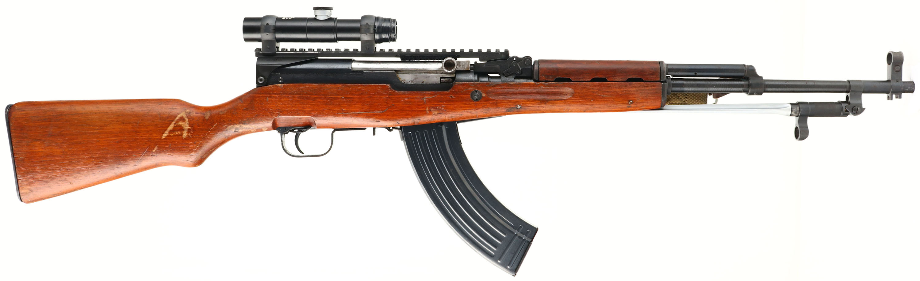 Chinese, Model: Type 56 SKS, Cal: 7.62x39mm, MFG: Mid 1970's, S/N: 22000834, Semi-auto rifle, 20 1/4'' barrel. The semi-pistol grip wood stock is very good with nicks, dings, scratches & wear from use/age. The Last 6 digits of the S/N are stamped into the left cheek of the stock. The blued metal finish rates 90% overall with a few spots of wear & patina/rust speckling. The left side of the receiver is marked with a buffed rectangle arsenal code that appears to read ''0?35'', Three Chinese characters that read ''TYPE 56 CARBINE'', S/N, ''D'', & import markings. The top rear of the barrel is marked ''50''. S/N matching bolt, trigger guard, & receiver cover. The bore is excellent. Bright & mirror like with little visible wear. The barrel holds a post front sight with protective globe. Rifle has a Magwedge SKS Kwikrail attached, it hooks into the rear sight & has two screws that tenson onto the rear of the receiver. The rail has mounted a Mosin PU style aftermarket scope, 3.5 x 22, has PU style recital. Front of scope has electrical tape around it. The stock carries a blued steel trapdoor buttplate. Trapdoor has cleaning kit inside. Rifle has a affixed folding cruciform bayonet, Green canvas sling, & a 30 Rd. detachable SKS mag (Not AK), Unknown MFG, marked USA on base plate. FFL Req. - Value: 400 to 800