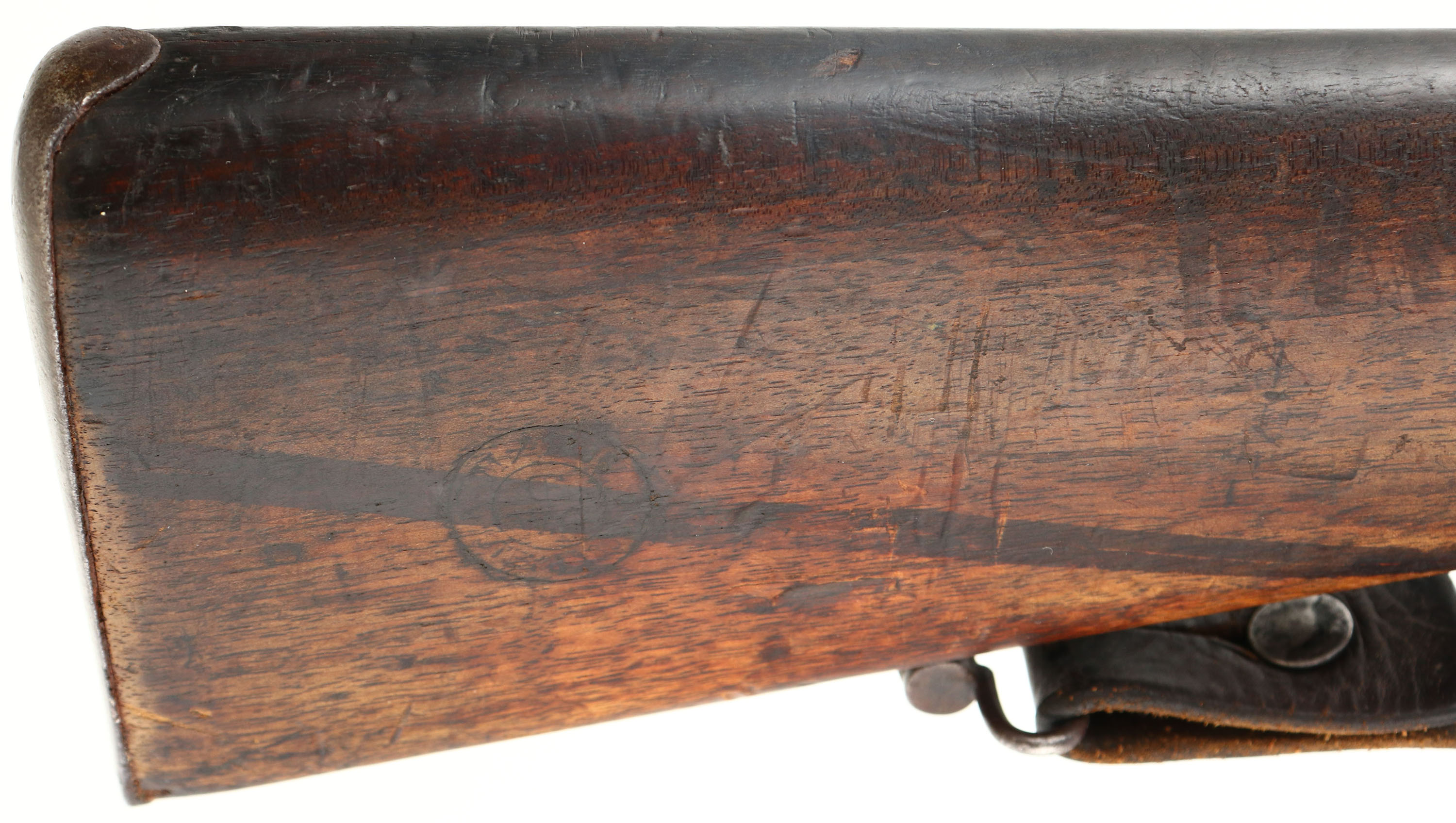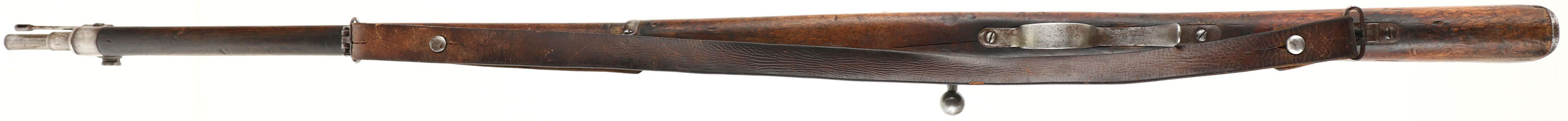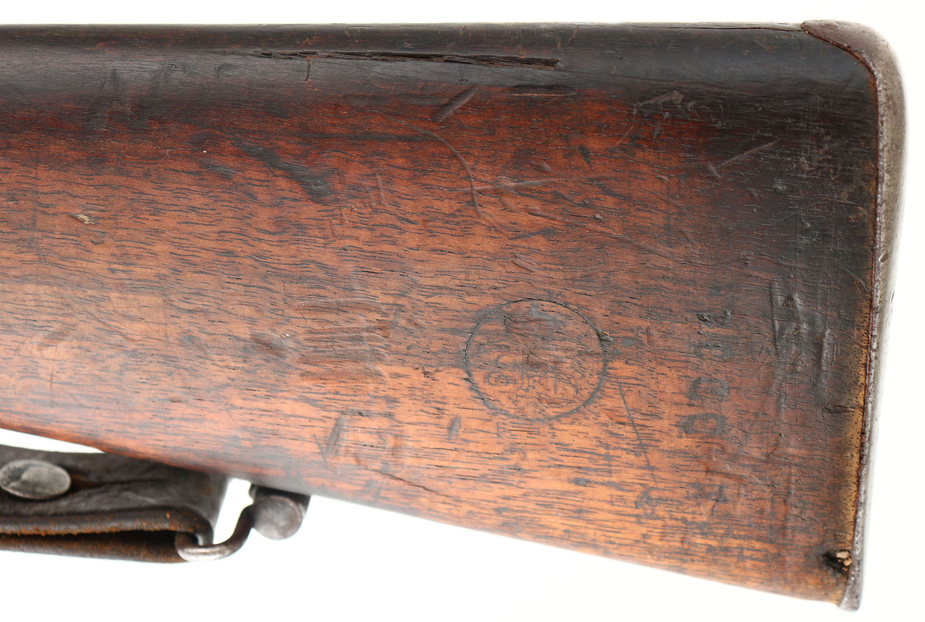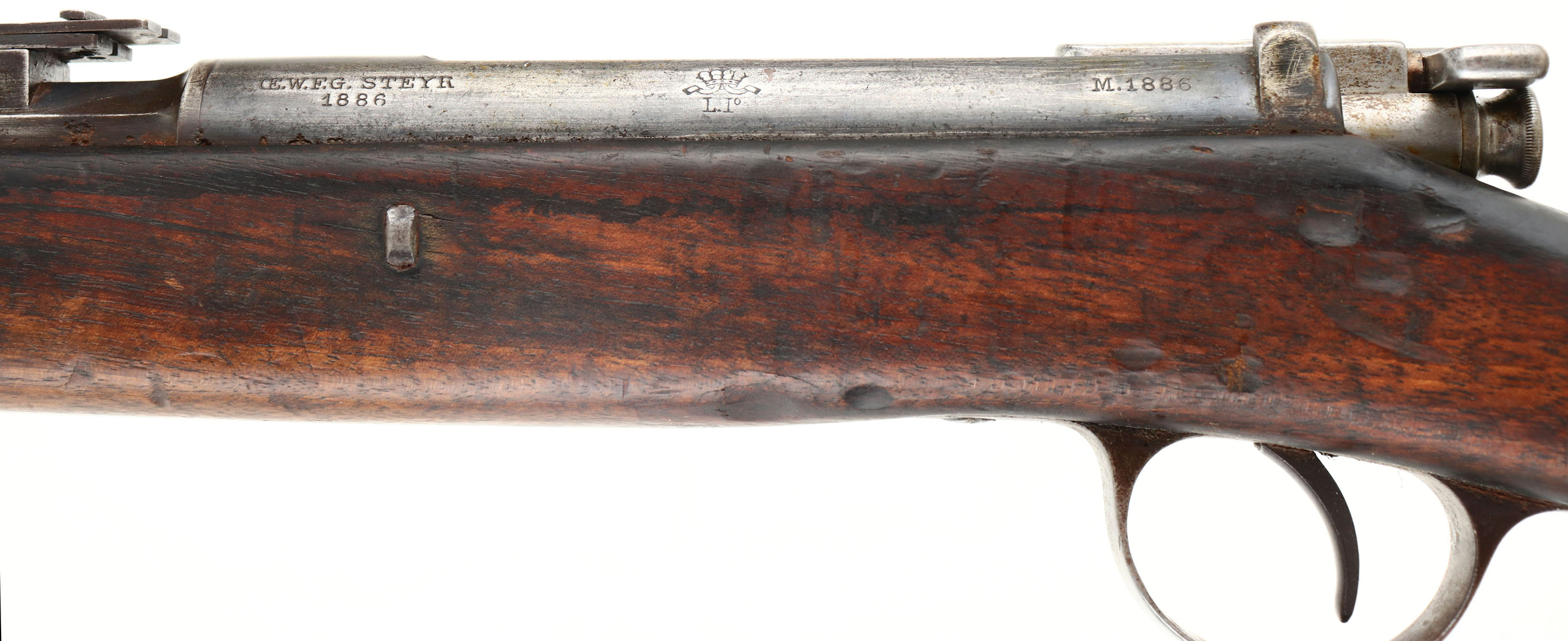 CONDITION: The straight wrist wood stock is good. Stock has nicks, dings, dents, scratches & wear from use/age. Stock has darkened from added oils over the years. Bottom of the stock has a 3 crack emanating from the trigger guard. Wood has shrunk around toe & buttplate is proud to wood. Right cheek of stock is marked with the monarchs cypher roundel, it would read with the model number (M1886) over the MFG & date of MFG (STEYR 1886), with ''OE.W.G.'' in the middle. Marking is worn & is illegible but is still visible. Left cheek is marked with a faded large round cartouche & the S/N ''BB81''. The trigger guard extends out to a pistol grip style finger rest. The metal has mostly worn gray with spots of thinned finish in protected areas, & speckling of brown patina. There is rust & pitting around the stock line. The left side of the receiver is marked ''OE.W.F.G. STEYR'', ''1886'', Crown over a banner over ''L.I'', ''M.1886''. the right side of the receiver & barrel are marked with the S/N. the top of the barrel is marked with a small crown proof. S/N mismatched bolt, the components are also a mix of S/Ns. the bore is very good. Its bright with spots of light roughness. The barrel holds a barleycorn front sight with a flip up ladder, V-notch rear sight marked 6 to 22. The stock carries a steel buttplate, toned brown with roughness. Rifle has both slings loops, cleaning rod, & comes with a brown leather sling marked ''J.BUROY'', ''SELLIER'', ''CUGY''. Antique, no FFL Req. - Value: 350 to 700