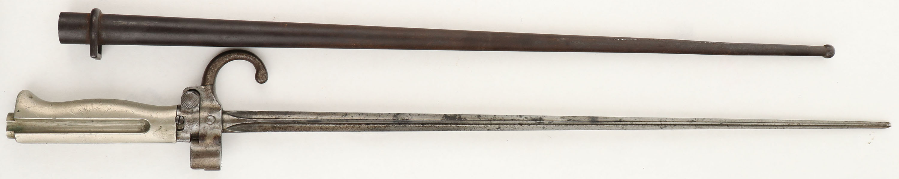 CONDITION: the straight wrist wood stock is very good with various nicks, dings, & scratches from use. The blued metal finish on the barrel rates 90% with some light thinning & wear. The blued metal finish on the receiver rates 80% with spots of thinning & brown patina. The left side of the receiver is marked with the S/N, ''I.G. MOD. 71''. The right side of the receiver is marked with three thinned imperial German proofs, ''1879'', ''82''. The ''82'' mark means this rifle was sent to a arsenal & re-worked/updated in 1882. the top of the barrel is marked ''L.F.t.P'', ''St. Denis''. S/N matching bolt, Extremely rare to find on these rifles. S/N mismatched screws. The bore is excellent. Bright with strong rifling & little to no visible roughness. The barrel holds a barleycorn front sight with a stepped base/ladder V-notch rear sight. Base marked 4 to 8, ladder marked 9 to 20. the stock carries a steel buttplate, has worn black paint finish. Has bolt sling loops & cleaning rod. Rifle also comes with a RARE M1886 Lebel bayonet converted to fit on the 6.5mm M1871/94. likely done by St. Denis since they were making this style of bayonet for the French government. Antique, no FFL Req. - Value: 600 to 3000