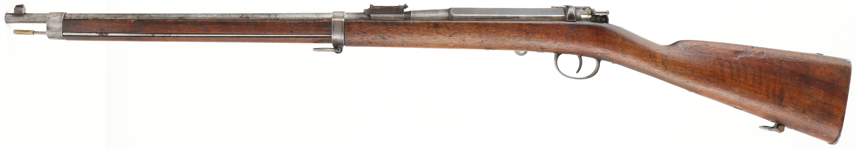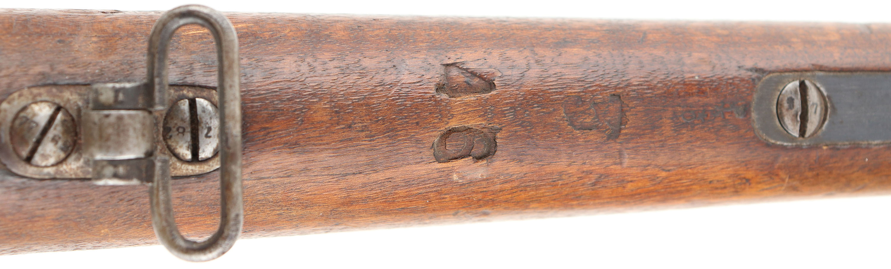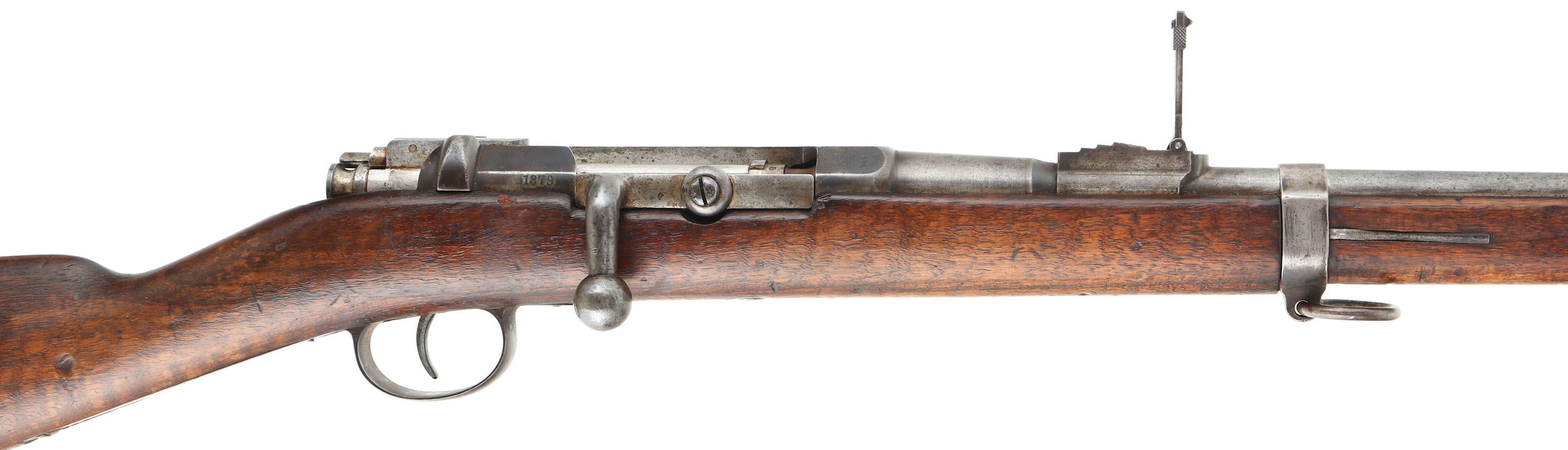 CONDITION: the straight wrist wood stock is very good with nicks, dings, dents, scratches & wear from use/age. Metal is proud to the wood in one spot on the lower tang & on the toe. The metal has mostly worn gray with areas toning brown. Chamber areas has spots of rust. The left side of the receiver is marked with the S/N, ''K.Mod.71.''. Right side of the receiver is marked with three imperial German proofs, ''1879''. The top of the barrel is marked ''L.F.t.P'', ''St. Denis''. S/N matching bolt, all other parts are mismatched. The bore is very good. Its bright with strong rifling with small spots of roughness. The barrel holds a barleycorn front sight with a stepped base/ladder V-notch rear sight. Base marked 2 to 10, ladder marked 12 to 20. The stock carries a bare steel buttplate, has brown patina speckling. Rifle has bottom sling loop & forward sling ring. Rifle has cleaning rod. A nice handy carbine with a unique story & interesting markings. Antique no FFL Req. - Value: 600 to 2000
