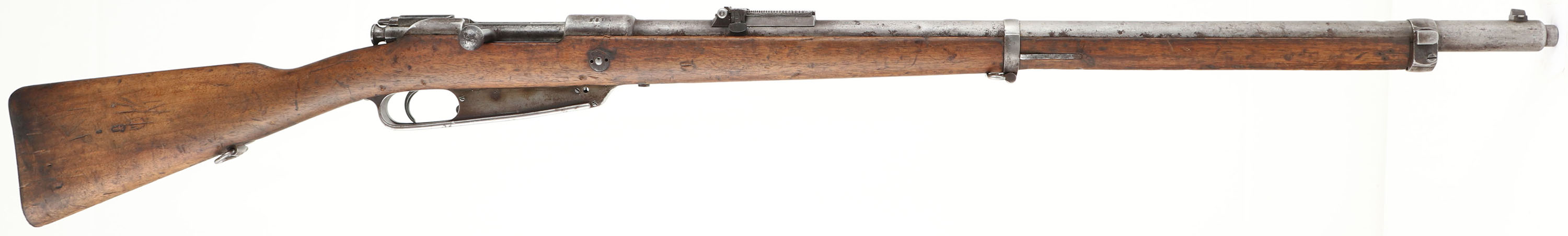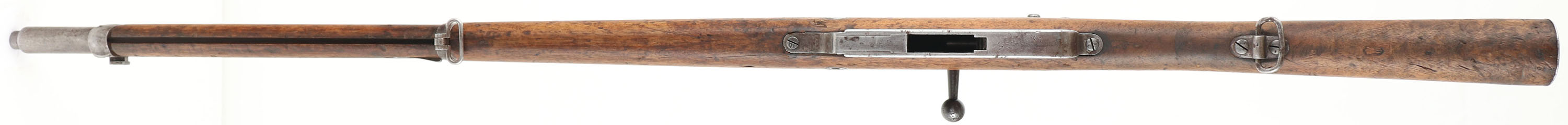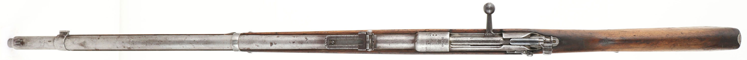 HISTORY: The Gew 1888 was Germany first smokeless powder rifle. It was a rushed response to the French inventing smokeless powder & using it in their new Lebel 1886 rifle. Instead of having a rifle designed by one person or company like their last two rifles, this one was designed by the German Gewehr prfungs kommission (GPK- rifle testing commission). That's where it got its nickname of Commission rifle. The GPK would start by trying to adapt the then new GEW 71/84 to use a new small bore smokeless cartridge. Thinks kept progressing & soon they started to make changes of their own & adding work from many different people. The bolt was the 71/84 bolt revised by Louis Schlegelmich, he made the bolt have a separate bolt face & front locking lugs. They took the clip & feeding design from Mannlicher, updated to feed either clip end. The barrel jacket design came from Armand Mieg, it mostly free-floated the barrel & protected it from dings. They copied the rifling from the lebel rifle. The new cartridge was a modified Swiss style rimless design with a jacketed bullet, based on Eduard Rubin ideas. Designs would start in December of 1887, & it would be adopted in November 1888, a really fast turn around. MARKINGS: The ''S'' above the chamber indicates its been reamed out for the 8mm Spitzer Cartridge, done around 1905. the punch mark above the ''S'' indicates it has improved barrel reinforcement where it screws into the receiver. The punch mark under the S/N on the jacket, indicates the wide part of the jacker the ''cup'' was soldered to the jacket with brass instead of lead, making it stronger. The ''n.m.'' marking under ''Gew.88'' means the barrel was made with ''new metal'', stronger steel with higher carbon content. The unit marking on the front barrel band means 2nd regiment of grenadiers, company 8, Rifle No.61.