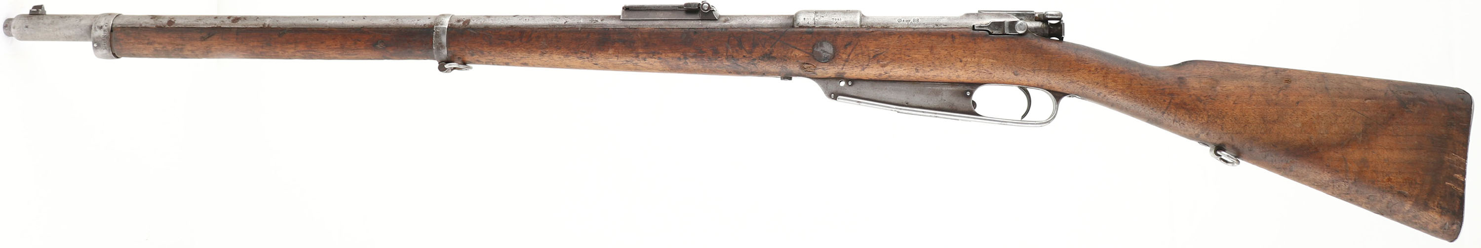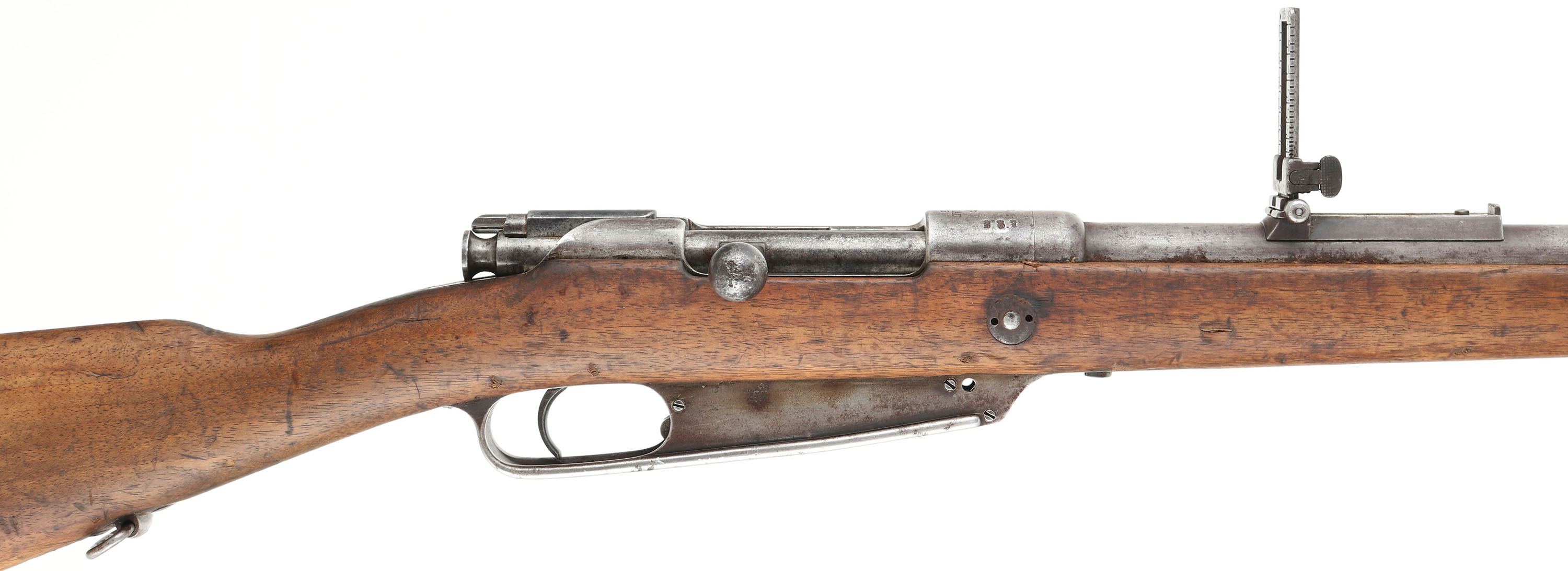 Spandau, Model: Gew 1888, Cal: 7.92x57mm J (8mm Mauser J), MFG: 1895, S/N: 7953, bolt action rifle, 29 3/8'' barrel. The straight wrist walnut stock is good. Has numerus small nicks, dings, chips, & scratches. The bottom of the wrist & the belly of the stock are marked with a small, faded crown proof. The right cheek of stock is marked with three faded cartouches, & the hand etched letters ''MP''. Small gouge in the wood on left side of the stock, by the recoil lug. The forend has seem to shrunk with the front barrel band not fully enclosing the end piece. The metal has mostly worn gray with spattering's of rust brown patina. The barrel jacket has a few small dents. The left side of the receiver is marked with the S/N, ''GEW.88'', ''n.m.''. The top of the receiver band is marked ''S'' with a punch mark above it, German crown, ''SPANDAU'', ''1895''. Right side of the receiver band is marked with three imperial German proofs. The left side of the barrel jacket is marked with the S/N, with a punch mark under it. Left side of the front barrel band is marked ''53'', ''2.G.R.8.61.''. Rear barrel band is marked ''53'', & a proof. The barrel bands, trigger guard/magazine, & rear sight & barrel jacket are S/N matching. Bolt marked ''2238'', all bolt has one mis matched part. The bore is very good. Its bright with very light roughness. The barrel jacket carries a barleycorn front sight with a flip up ladder, V-notch rear sight. Ladder marked 5 to 18, with a 20.5 notch on the top support. The stock carries a bare steel buttplate, has small spots of rust. Rifle has both sling loops. Rifle is missing cleaning rod. Antique, no FFL Req.