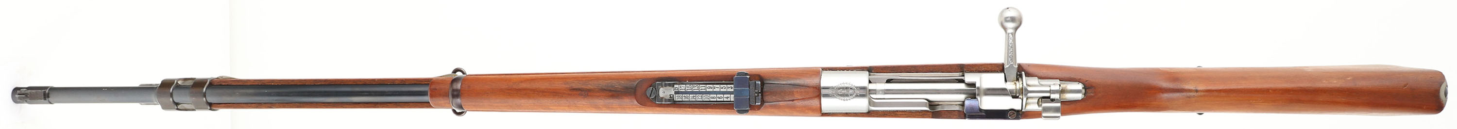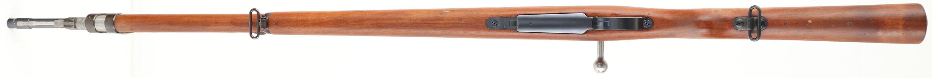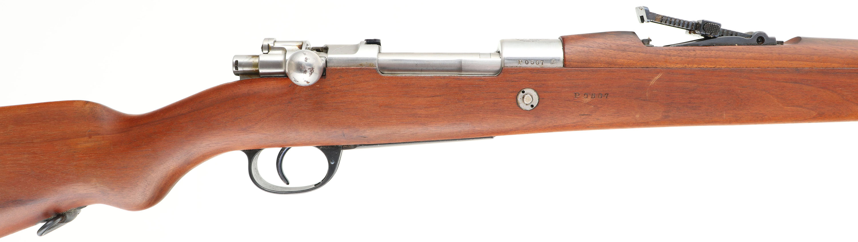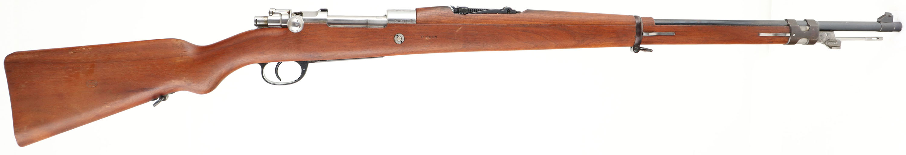 DWM, Model Argentino 1909 Mauser, Cal: 7.65x53mm Argentine, MFG: 1912, S/N: P0567, Bolt action rifle, 29 1/2'' barrel. The semi-pistol grip wood stock is very good, near excellent with a few dings & scratches. There are cartouches on the right cheek & belly of the stock, all are crisp & legible. The S/N is stamped into the right side of the stock, in front of the recoil lug. Upper handguard is marked with a sun over ''RA'' in a circle cartouche. With the condition the stock is in, it is likely a replacement stock from a arsenal. The stock was forced matched to the rifle when it was taken out of service, refurbished & put into storage. The blued metal finish on the barrel rates 96%, this was likely re-blued by the arsenal when it was refurbished. The receiver was left in the white (unfinished) from the factory. Left side of receiver is marked ''MAUSER MODELO'', ''ARGENTINO 1909'', ''DEUTSCHE WAFFEN-UND'', ''MUNITIONSABRIKEN.BERLIN'', top of receiver is marked with the Argentina coat of arms, right side of receiver is marked with S/N & a inspector mark. S/N matching Bolt. The bore is excellent. Bright & mirror like with little to no visible wear. The barrel holds a barleycorn front sight with a tangent V-notch rear sight marked 3 to 20. the stock carries a bare steel buttplate. Rifle has both bottom sling swivels, & has a S/N matching cleaning rod. The ''P'' serial block was the last block of 10,000 Rifle made by DWM. A excellent example of a Arsenal refurbished Argentine Mauser. FFL or C&R Req. - Value: 300 to 600