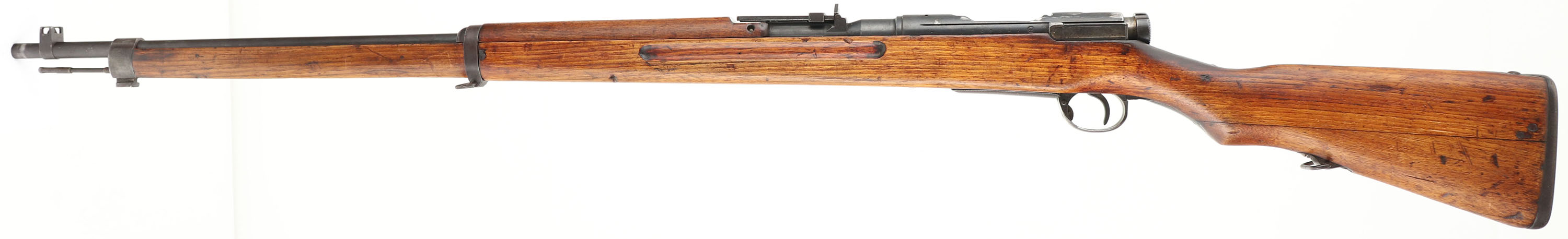 Nagoya Arsenal, Model: Type 38, Cal: 6.5x50mmSR, MFG: Sept 1939-Sept 1940, S/N: 68817 Series 27, Bolt action rifle, 31 1/4'' barrel. The semi-pistol grip wood stock is very good with nicks, dings, scratches, & wear from use/age. The blued metal finish rates 85% overall with spots of wear & brown patina. The top of the receiver band is marked with a intact chrysanthemum & ''TYPE 38'' in Japanese. The left side of the receiver is marked with the series logo, the S/N, & the Nagoya arsenal logo. Bolt is marked ''817'', all marked parts including the stock are S/N matching to the rifle. The bore is fair. It is bright with strong rifling, but has roughness throughout, spots of light pitting & the rifling is worn almost smooth at the muzzle. The barrel holds a barleycorn front sight with protective ears, & a flip up Aperture ladder rear sight marked 5 to 24. stock carries a cupped blued steel buttplate, has wear & patina around edges. Rifle has both sling loops, & has the cleaning jag. FFL or C&R Req.