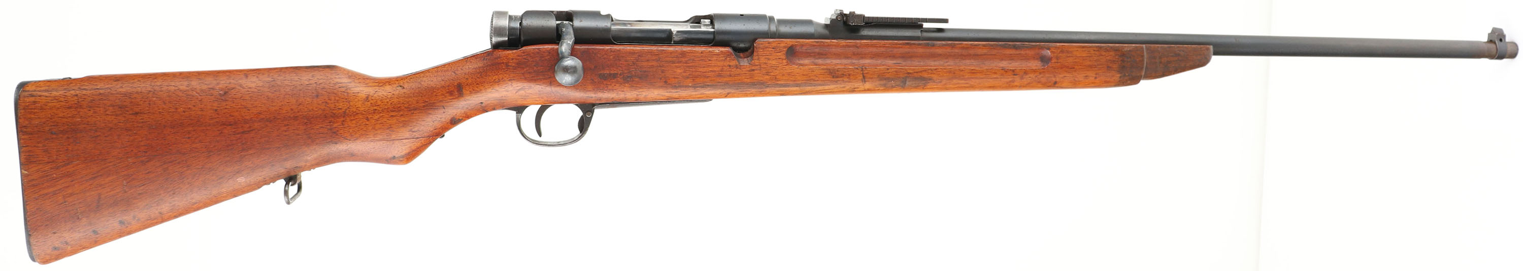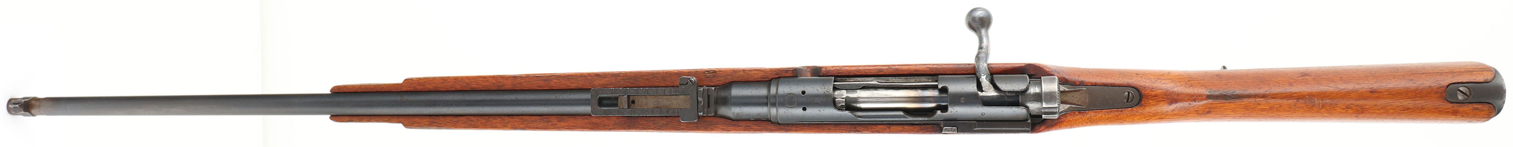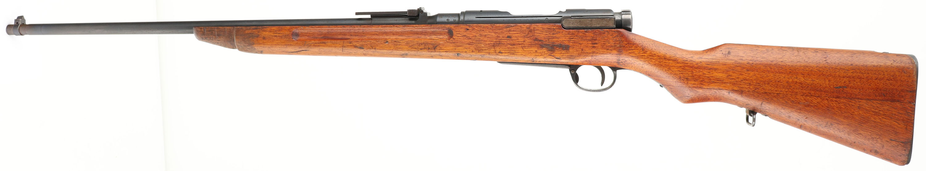 Tokyo Arsneal, Type 38, Cal: 6.5x50mmR, MFG: 1906-20's, S/N: 1205259, Bolt action rifle, 25'' barrel. The semi-pistol grip Japanese walnut stock is very good as being cut down, lightly sanded & oiled. The belly of the stock is marked with three Japanese character cartouches. The blued metal finish rates 85% overall with spots of thinning & rust speckling. The left side of the receiver is marked with the S/N, Tokyo Arsenal logo, & two small inspector stamps. The top of the receiver band is marked with a fully intact chrysanthemum, & ''TYPE 38'' in Japanese characters. The rear receiver bridge is marked with a small triangle in circle stamp & a small circle stamp. The left side of the barrel is marked with a small triangle in circle stamp, & ''S''. The bolt handle has grind & weld marks & has been bent down crudely. The bolt handle hits the stock before fully locking into battery & will not fire, the stock either needs shaved, or bolt handle needs fixed. The bore is very good. Its bright with strong rifling, but has light roughness. The barrel holds a barleycorn front sight with a flip up ladder V-notch rear sight marked 6 to 24. the stock carries a blued steel buttplate, has spots of rust. Rifle has rear sling swivel. FFL or C&R Req. - Value: 100 to 200