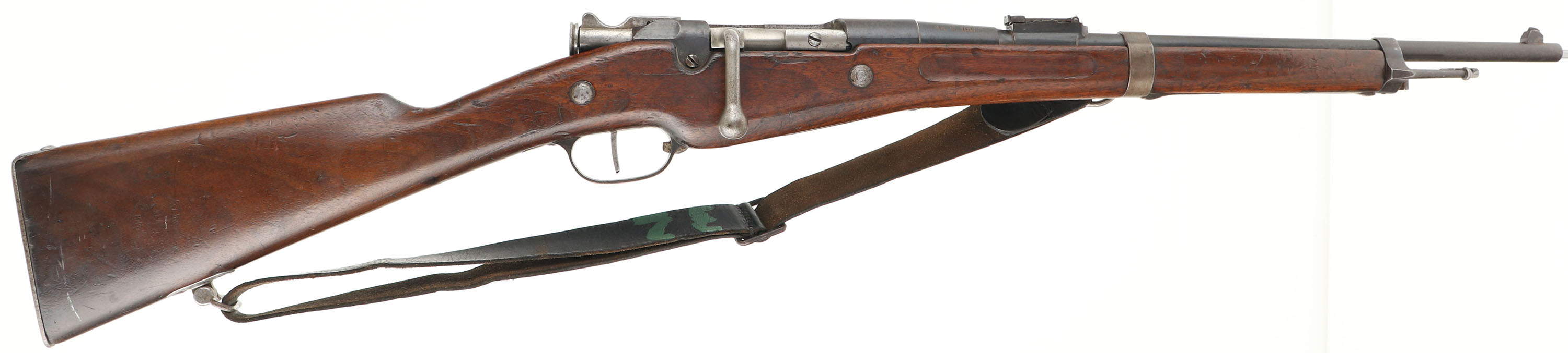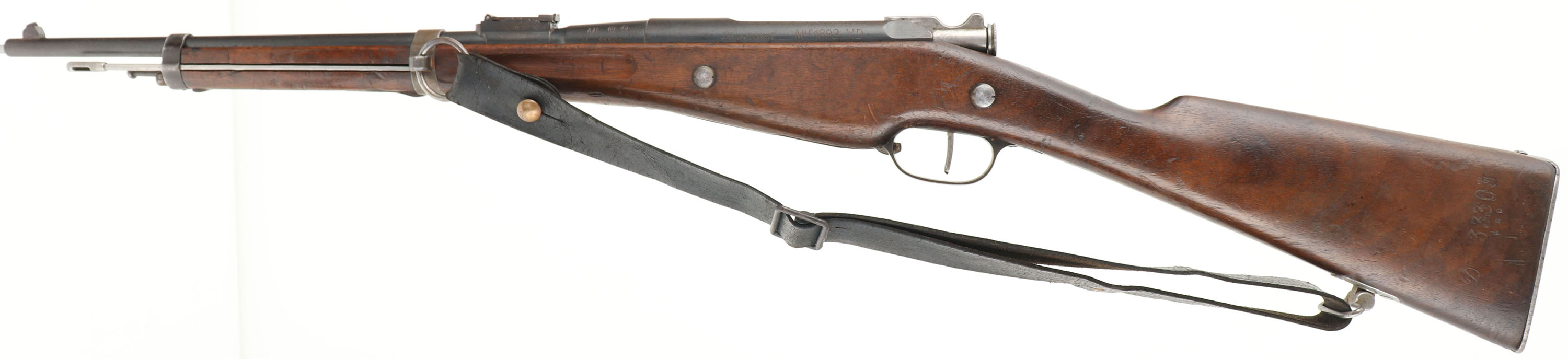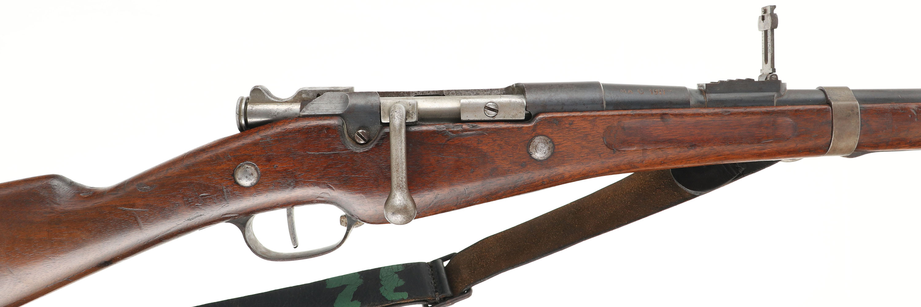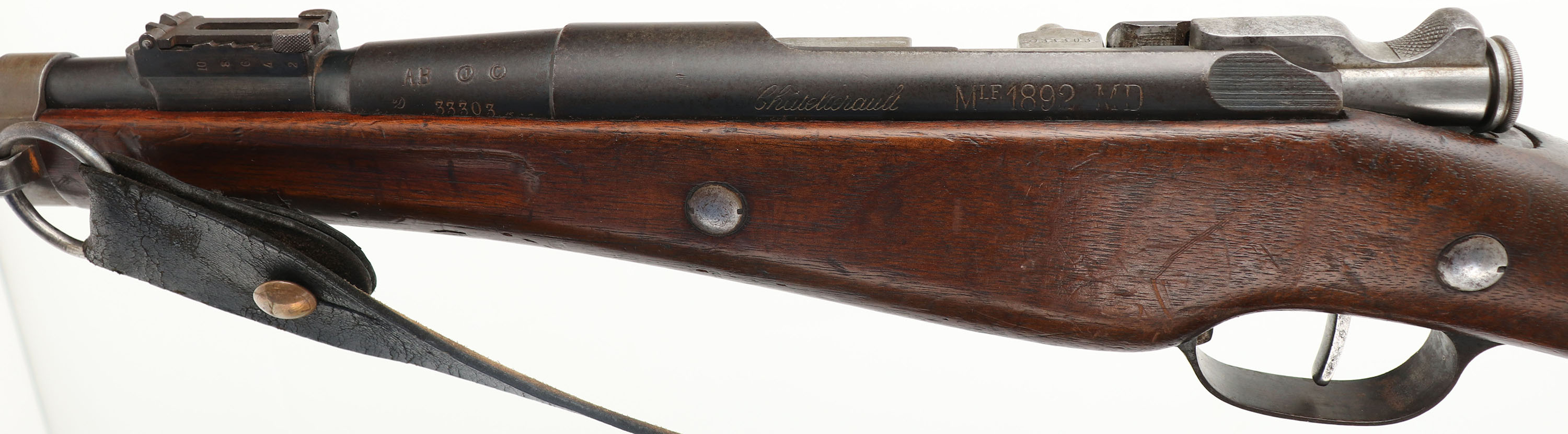 CONDITION: the straight wrist wood stock is very good with small nicks, dings, & scratches from use/wear. 1'' x 1 1/2'' inlaid wood stock repair on left side of forend,. The S/N is stamped into the left cheek of the stock. The right cheek is marked with the acceptance roundel that reads ''MARCH'', ''1917'', ''J.C.'', ''MA''. The blued metal finish rates 75% overall with areas of thinning/wear & spots of brown patina. The left side of the receiver is marked ''CHATELLERAUT'', ''MLE 1892'', ''MD''. The left side of the barrel is marked ''AB'', ''J'' in circle, ''C'' in circle, & the S/N. the rear extension of the trigger guard is marked ''CW'' in a circle. The right side of the barrel is marked ''MA C 1917''. S/N matching bolt & magazine. The bore is good. Its bright but has beginnings of pitting & consistent roughness throughout. The barrel holds blade front sight with a stepped base/ladder U-notch rear sight. Base is marked 2 to 10, ladder is marked 12 to 20. The stock carries a steel buttplate, worn gray with speckled patina. Rifle has rear sling loop with forward ring. Rifle has a wartime production steel clearing rod. rifle comes with period correct black leather sling, & correct MLE 1892 Bayonet. FFL or C&R Req - Value: 700 to 1400