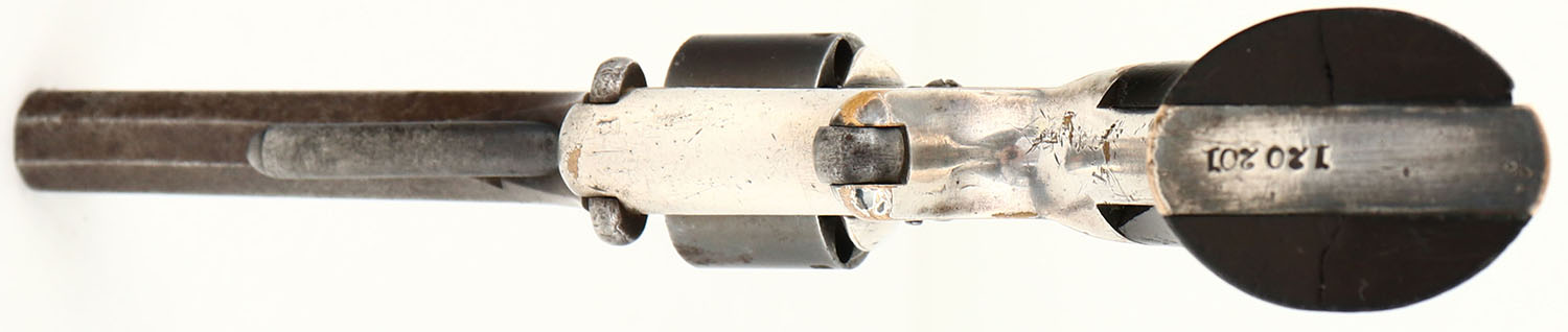 Smith & Wesson, Model Number One, 2nd Issue, CAL; 22 RF SH BP, MFG: 1860-68, SN: 120201, Single Action Tip-Up Revolver, 3 3/16''. The top of the barrel is marked ''SMITH & WESSON SPRINGFIELD MASS''. The butt is marked with the the full SN. The inside of the right grip has a full matching Sn stamped into it. The original two-piece rosewood grips are good & solid. There is a small grain crack in both grips, starting at the bottom, working up next to the screw hole & a small edge chip on the bottom left corner. The original finish has some scrapes, dings & areas of flaking finish. The metal blue finish on the barrel has fully worn to metal gray, with spotting toned to a brown patina. The original nickel finish on the brass frame rates 85-90%, with corners & edges worn to brass. Bore is fair, with roughness & intermittent pitting. Small blade front sight & small notch rear sight. Appx 117,000 produced. An all original, SN matching, excellent example of a Number One, 2nd Issue. Antique, No FFL Req. - Value: 1000 to 1700
