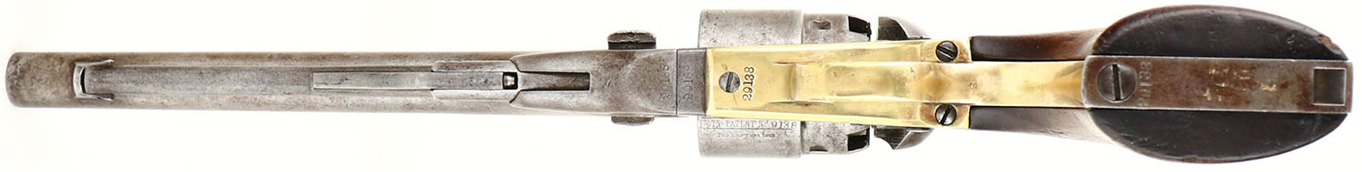 Colt, 1860 Army - U.S Military, CAL: .44, MFG: early 1862, SN: 29138, Single Action Percussion Revolver, 8'' round barrel. Martially marked. The original wood grips are very good, having been lightly sanded, with protective oils/finish added over time. The inspector cartouches on the grips are barely visible, but you can make out the outline of the initial box. The backstrap./butt is cut for a stock. The metal surfaces have fully worn to metal gray, with areas toned to a brown patina. The brass trigger guard is bright, having been cleaned. Bore is good, with intermittent pitting. Small blade front sight. The top of the barrel is marked ''ADDRESS SAM L COLT NEW- YORK U.S. AMERICA''. The left side of the frame is marked ''COLT'S PATENT''. The Texas Naval scene on the cylinder has worn smooth, but the patent markings, serial number & inspector mark are still visible. There are multiple inspector marks on the revolver, such as: ''T'' on the top of the backstrap, ''S'' on the trigger guard, behind the trigger loop, ''C'' on either side of the barrel, on the cylinder, between two nipples & ''B'' above the serial number on the cylinder. All matching SN on the frame, trigger guard, barrel, butt, cylinder & wedge. Antique, No FFL Req. - Value: 1000 to 2000