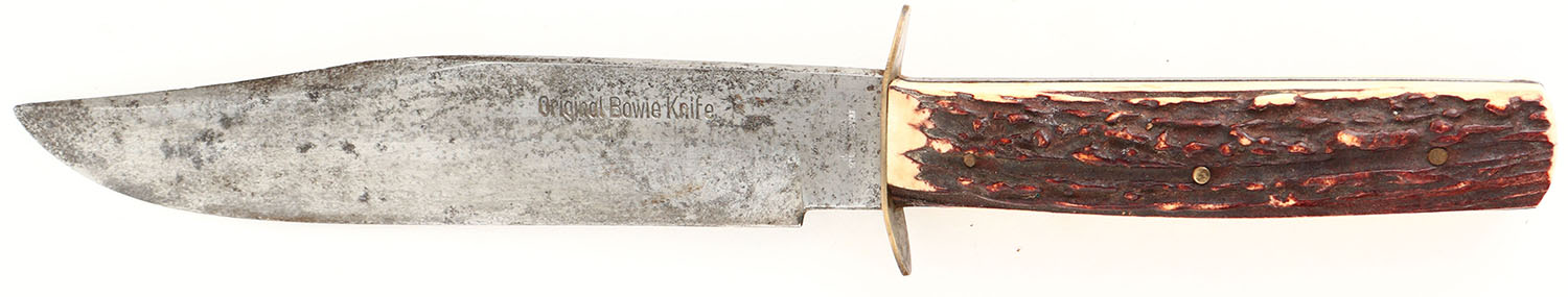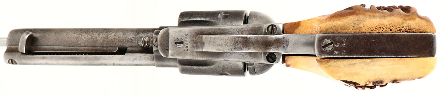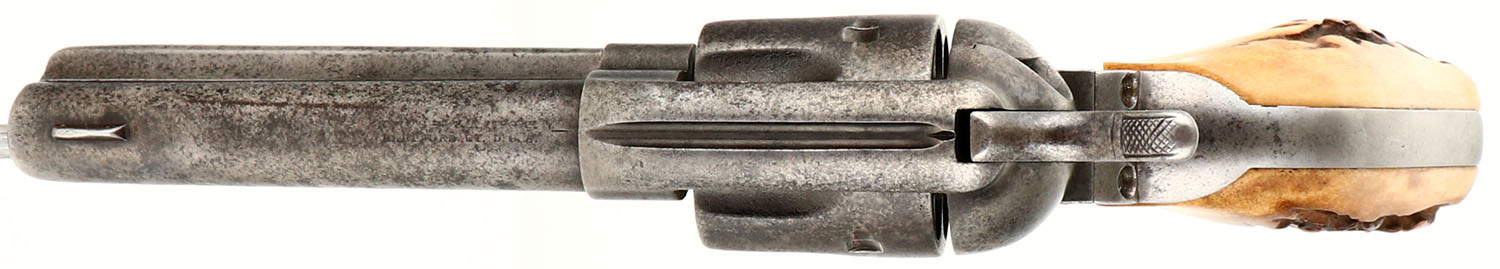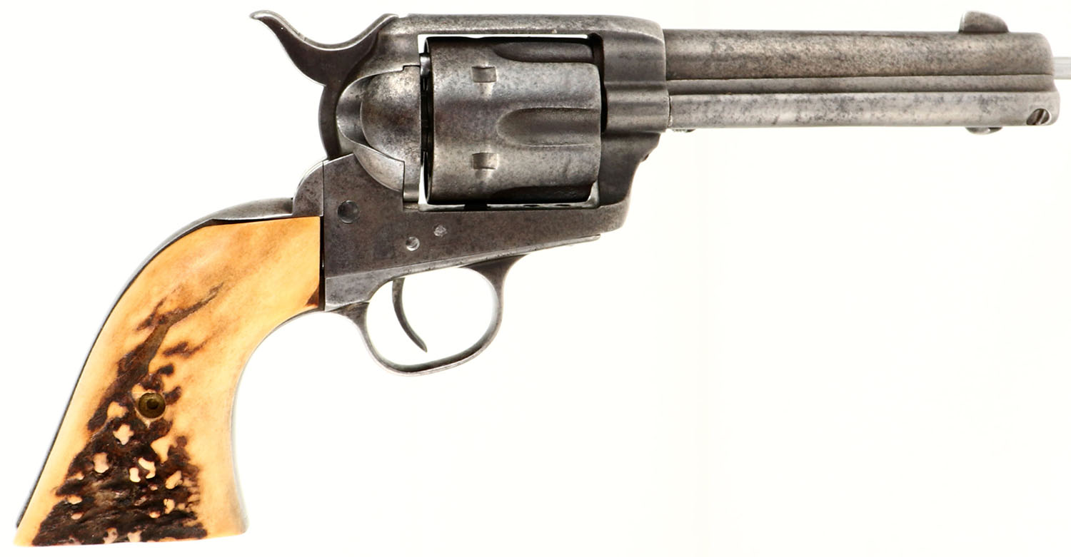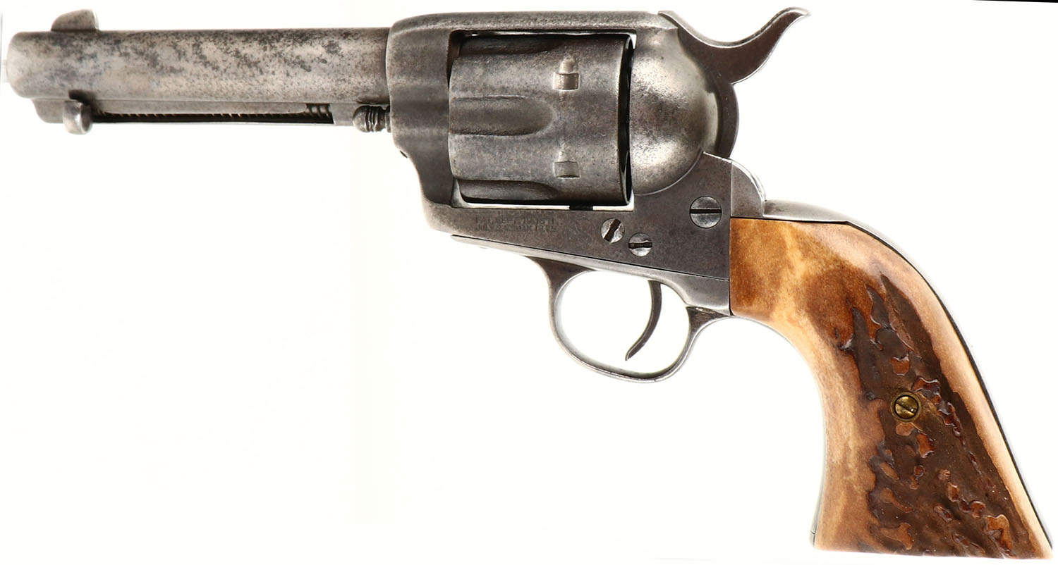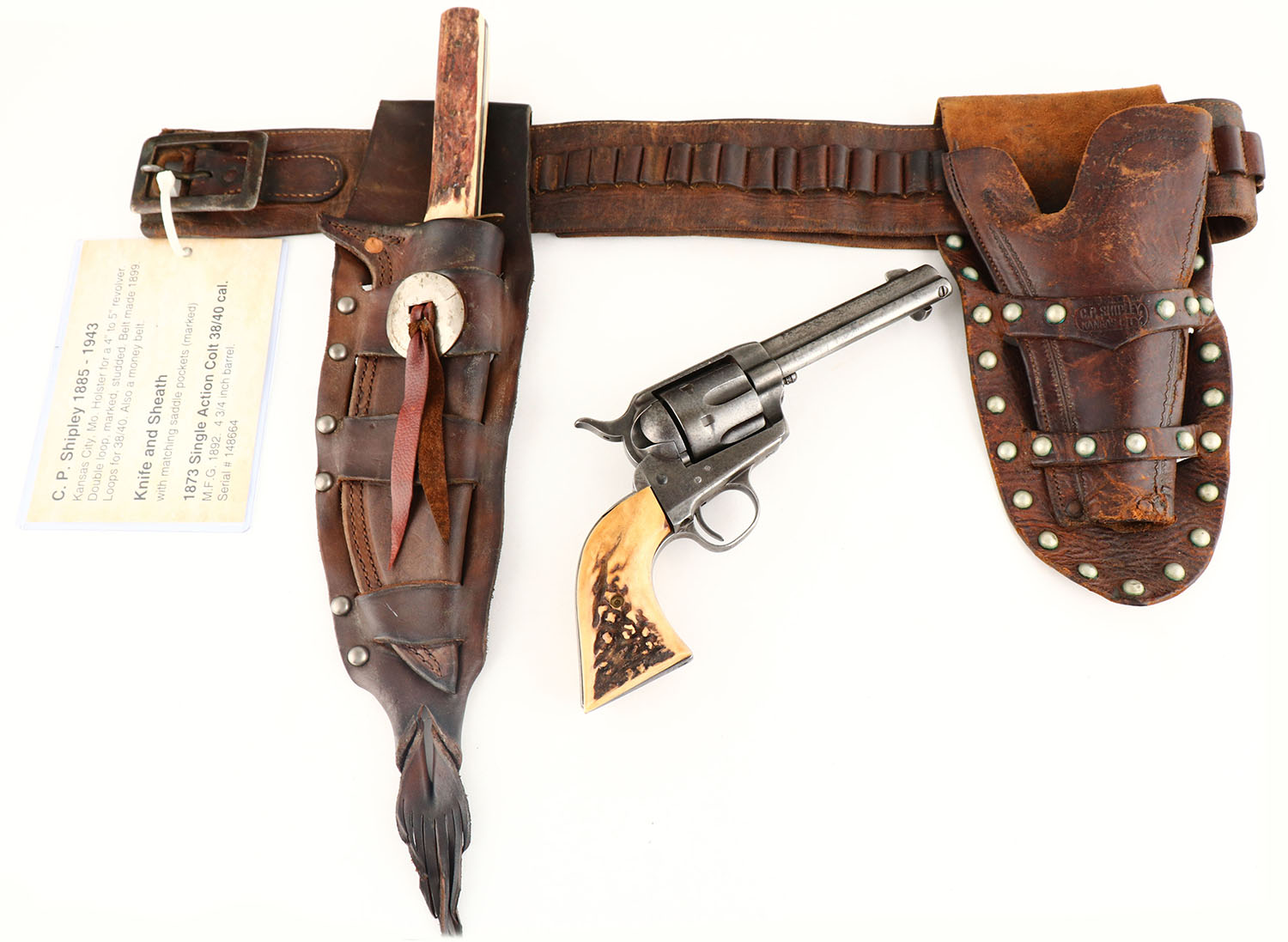UNIQUE SET, Colt, 1873 Single Action Army, CAL: 38-40, MFG: 1892, SN: 148664, Single Action Revolver, 4 3/4'' barrel. The top of the barrel is faintly marked in two lines ''COLT'S PT F.A MFG CO HARTFORD CT. U.S.A.''. The left side of the frame has the standard two-line patent dates & the circled Rampant Colt logo is crisp. Matching full SN on the frame, trigger guard & butt. The Stag grips are excellent, with nice figure. The metal finish has fully worn to gun metal gray, with consistent spotting & speckling toned to a brown patina. Bore is fair, consistently rough, with thin rifling. Integral v-notch rear sight & blade front sight. This gun is accompanied by an unmarked ammo/money belt, with loops for 30 Cal or similar size cartridges. The belt has a ''99'' over ''30 30''. The belt carries a studded double loop holster by C.P Shipley, Kansas City & a K.A COLEMAN HALSEY, OR studded leather knife sheath. The sheath carries an Original Bowie Knife by B.Svoboda Solingen, Germany, with Stag antler handle. The blade has sharpening marks & some small areas of pitting. Additionally, the belt is decorated with a railroad police badge that's marked ''RAILROAD POLICE'' & ''U.P R.R'' in the center, with two stars on either side. A custom & unique set, perfect for an Old West or Colt collector. Antique, No FFL Req. - Value: 2000 to 5000