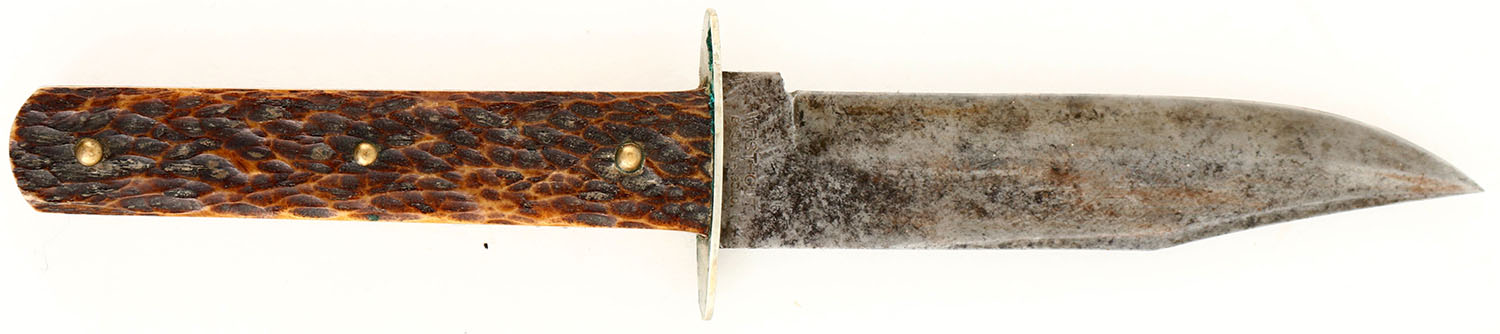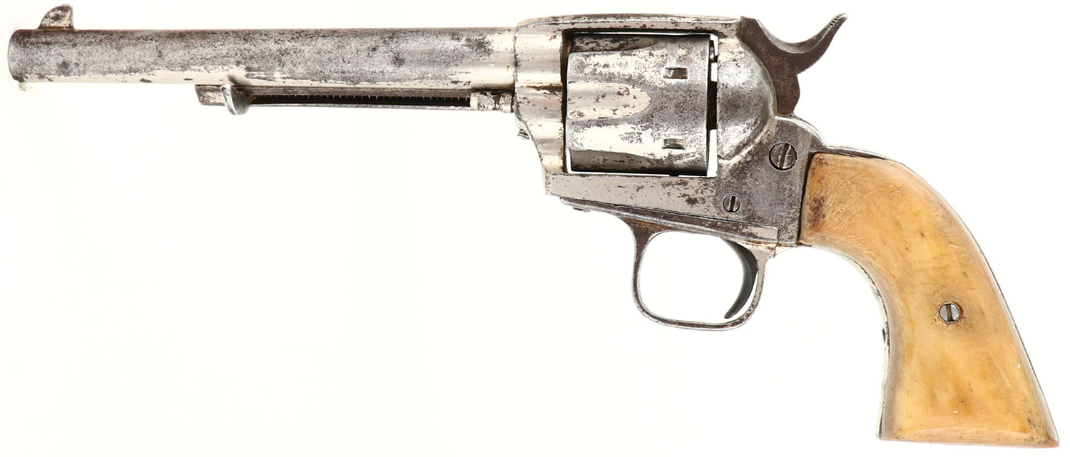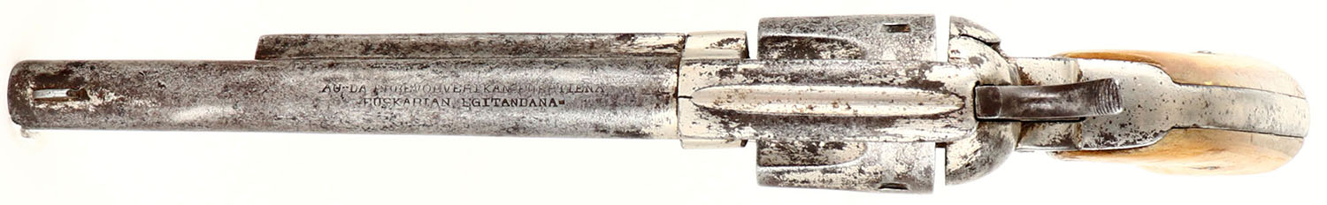 UNIQUE SET, European (Spain), Revolver, CAL: 36?, MFG: Pre 1898 (Antique), SN: NVSN, Single Action Revolver, 6'' barrel. The bone grips are good. They have scrapes, dings & an added layer of varnish that's mostly worn dull. The original nickel finish rates 30% on the barrel, with areas worn to metal gray & toned to a brown patina. The frame rates 60%, with areas worn to metal gray & toned to a brown patina. There is light pitting throughout the metal surfaces. Bore is poor, dark & rough. Small blade front sight. The top of the barrel is marked ''HAU-DA EBBEVOLVERIKAN FUERTIENA EUSKARTAN EGITANDANA''. A rough translation is ''This is the strongest revolver I have done'' in the language of Basque, according to Google translate. Mechanical function appears to operate properly. Basque is a language spoken by residents of the Basque Country, a region that straddles the westernmost Pyrenees in adjacent parts of northern Spain & southwestern France. Basque is classified as a language isolate (unrelated to any other known languages) and the only language isolate in Europe. This gun is accompanied by a hand made black leather Native American beaded belt, with beaded bag, circa 1890's, it is 3 1/3'' wide. The pouch is in the image of an hourglass, made of blue, red, pink, black, white & yellow seed beads. The beaded image consists of a white body & floral arrangements, with black vines & blue, red, green & gold flowers made from seed beads. The belt carries a Hercules single loop holster that's been hand tooled with floral patterns & decorative border, an unmarked knife sheath that holds a WEST-CUT Boulder, Colo. blade. The blade has intermittent spotting toned to a brown patina & an antler handle. A unique set that would present wonderfully in an Old West or Native American collection. FFL or C&R Req. - Value: 1000 to 3000