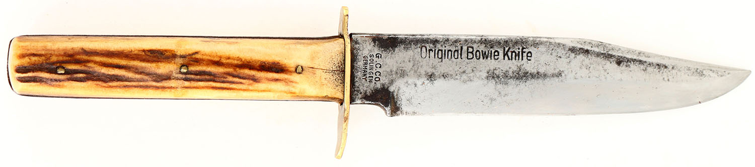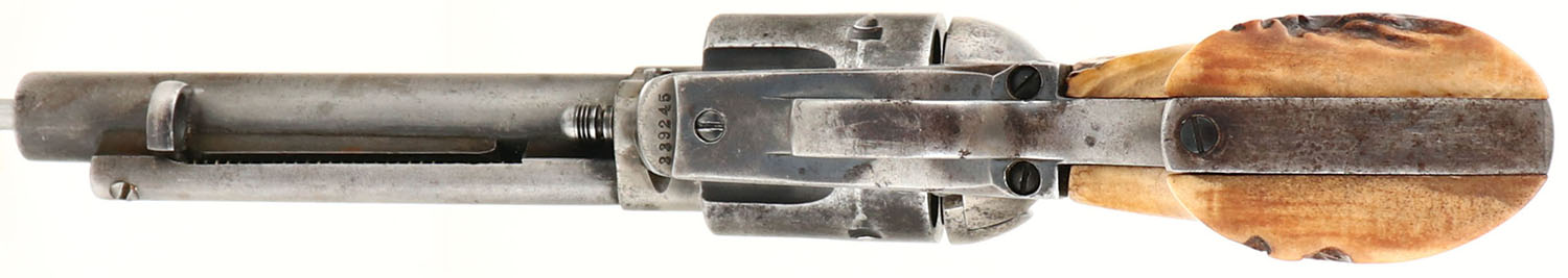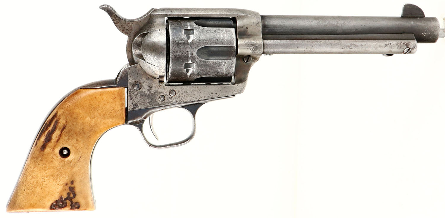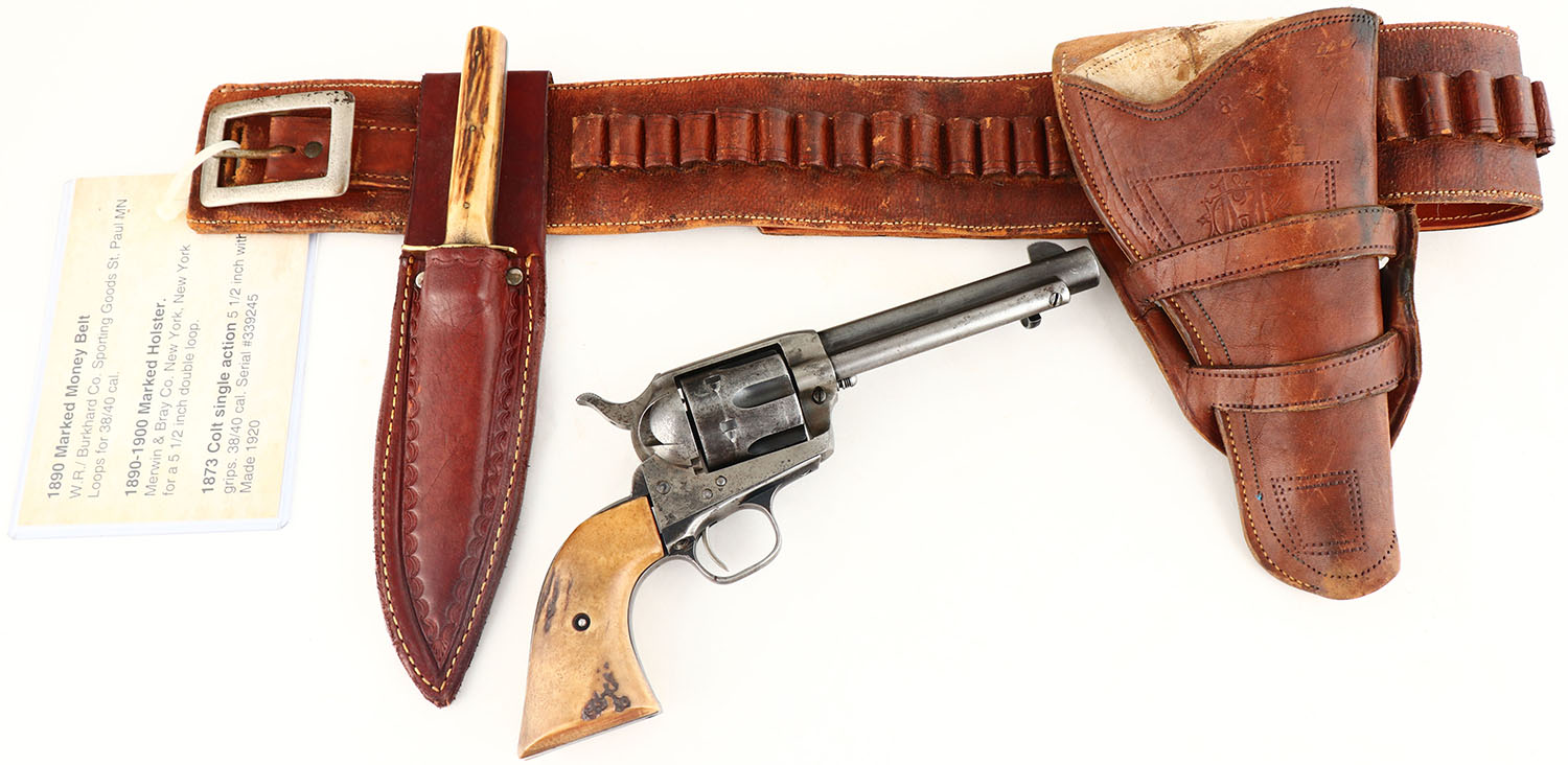 UNIQUE SET, Colt, 1873 Single Action Army, CAL: 38 WCF, MFG: 1920, SN: 339245, Single Action Revolver, 5 1/2'' barrel. The authentic Stag grips are excellent. The edges are smooth & they have a nice aged caramel patina. The original metal blue finish on the barrel has worn to metal gray & toned to a brown patina, with small traces of original blue left in protected areas. The case-hardened frame retains small amounts of visible case-colors in heavily protected areas, with some shadowing remaining, but mostly worn to metal gray, with spotting toned to a brown patina. Bore is very good & bright, with intermittent roughness. V-notch rear sight & dorsal fin blade front sight. Mechanical function is excellent. This revolver is accompanied by a circa 1890's leather ammo belt marked ''WM R. BURKHARD CO. SPORTING GOODS ST. PAUL, MN'' with loops for 30 cal cartridges. The belt carries a circa 1890-1900 Merwin & Bray double loop holster, marked ''WB'' on the front, & a ''K.A Coleman Maker Halsey, OR'' tooled knife sheath. The sheath carries an Original Bowie Knife marked ''G.C CO SOLINGEN, GERMANY #445''. A unique set that would present wonderfully in a Colt or Native American collection. FFL or C&R Req. - Value: 2000 to 5000