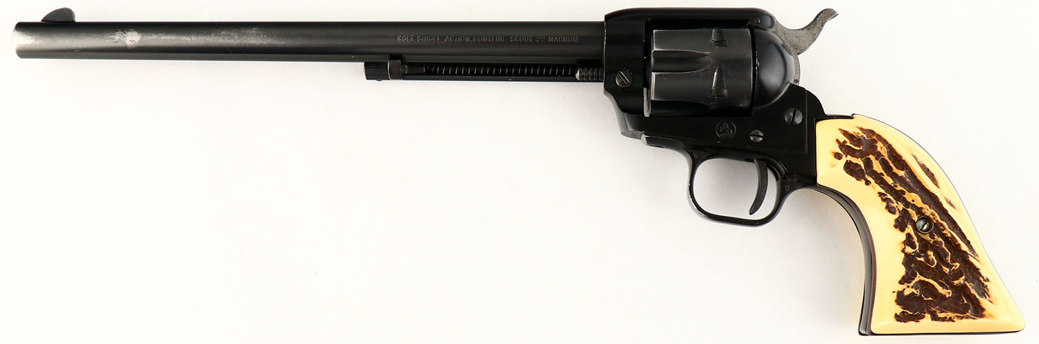 Colt, Single Action Buntline Scout, CAL: 22MAG, MFG: 1960, SN: 124925F, Single Action Revolver, 9 1/2'' barrel. The faux stag grips are excellent. The original metal blue finish on the barrel rates 85% & the matte black finish on the alloy frame rates 95%. Bore is excellent. Integral square notch rear sight & blade front sight. FFL or C&R Req. - Value: 300 to 500